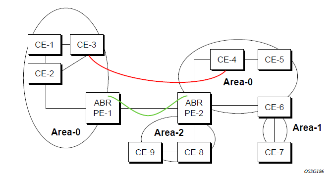 The following figure shows the red link between CE-3 and CE-4 could be a low speed OC-3/STM-1 link but because it establishes a intra-area route connection between the CE-3 and CE-4 the potentially high-speed PE-1 to PE-2 connection will not be utilized. Even with a super backbone configuration it is regarded as a inter-area connection.