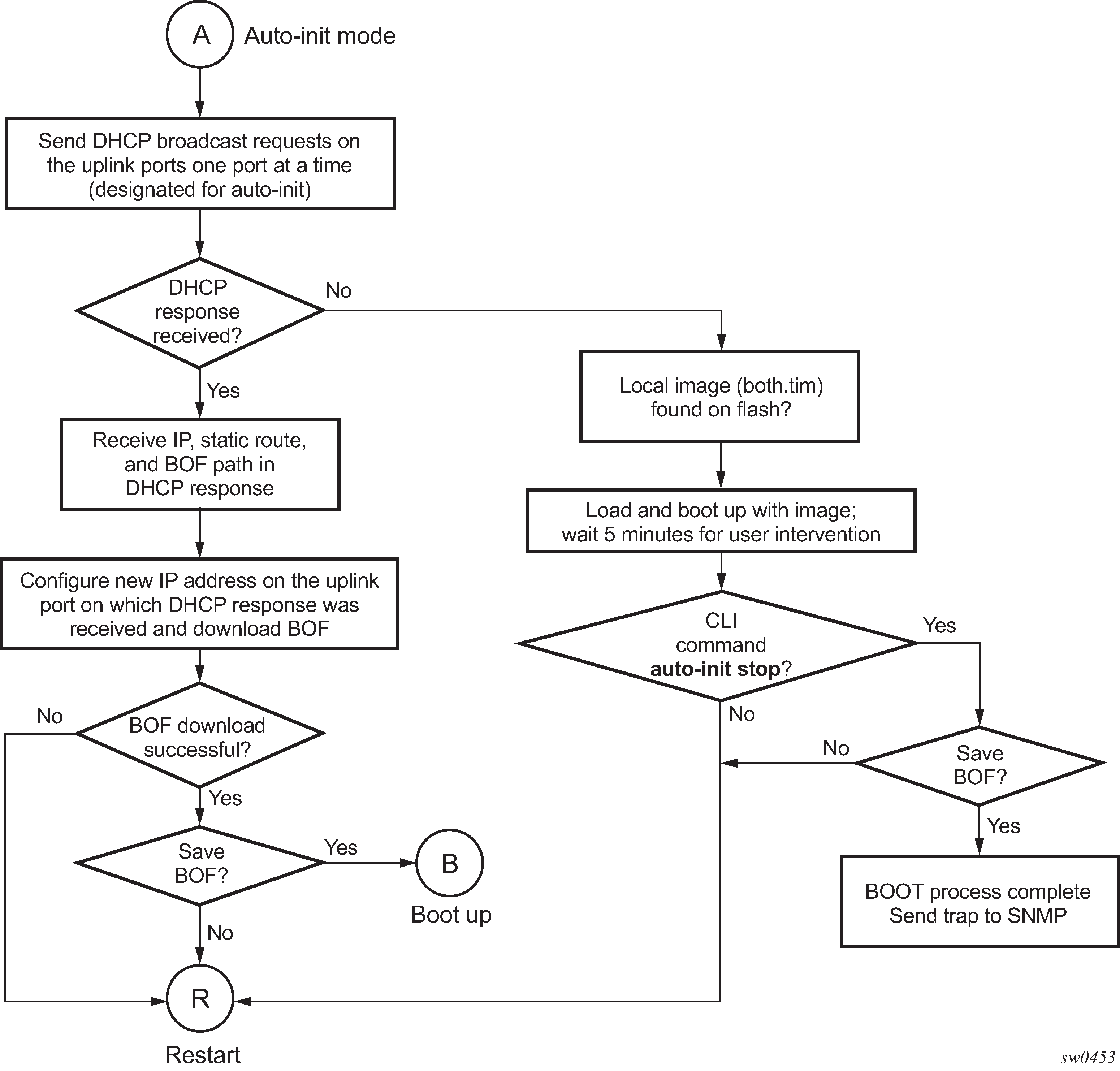 boot the system by retrieving the BOF from the network, using DHCP to retrieve the network location of the BOF (auto-init mode); auto-init mode is the default boot procedure if there is no manual intervention during the first boot of the node