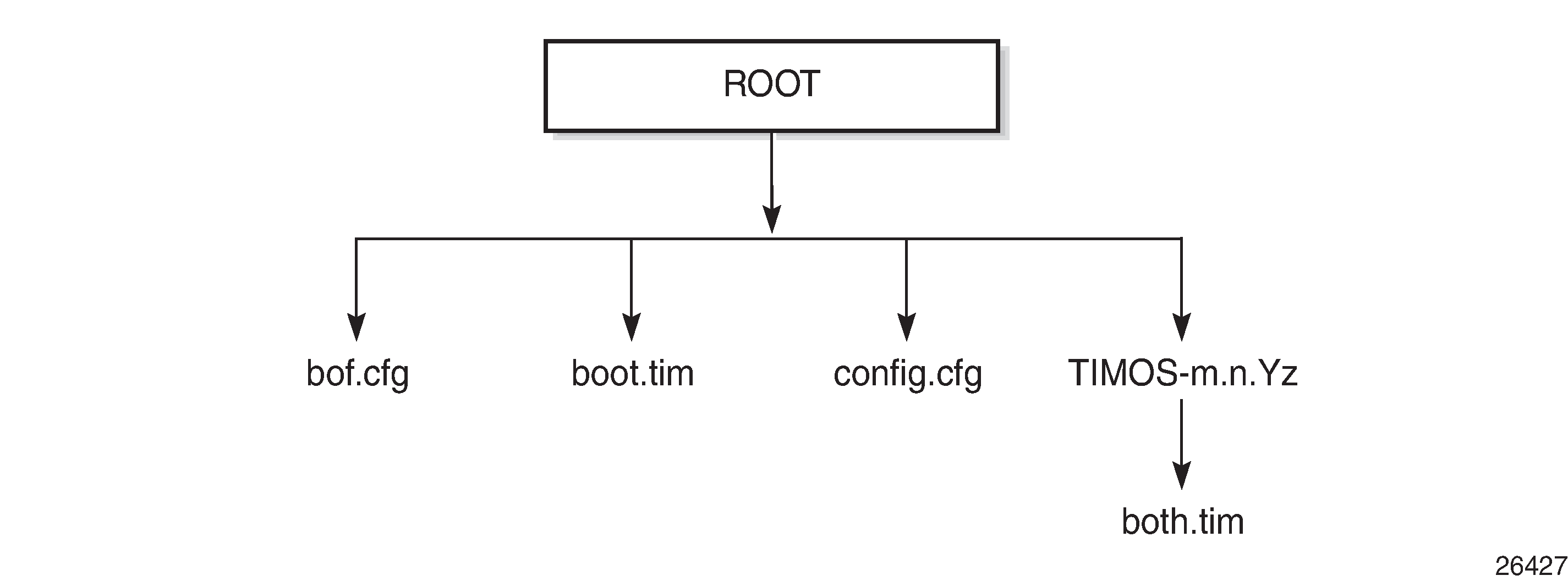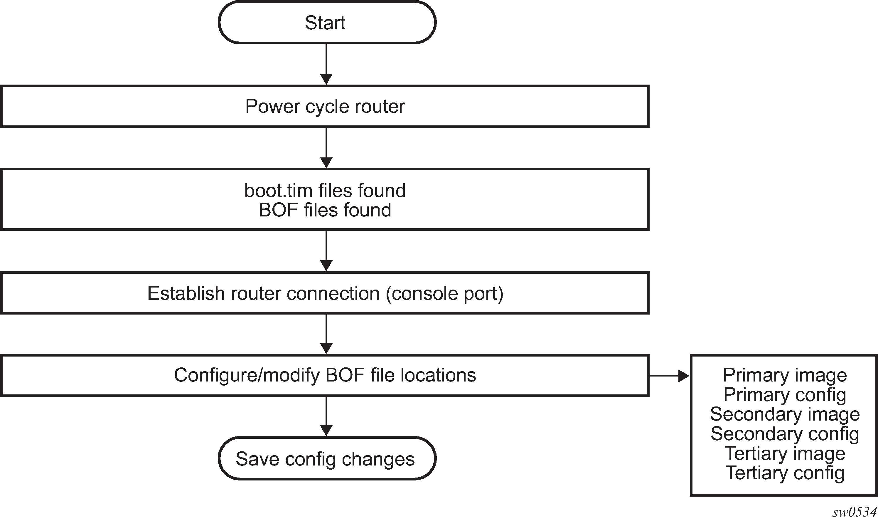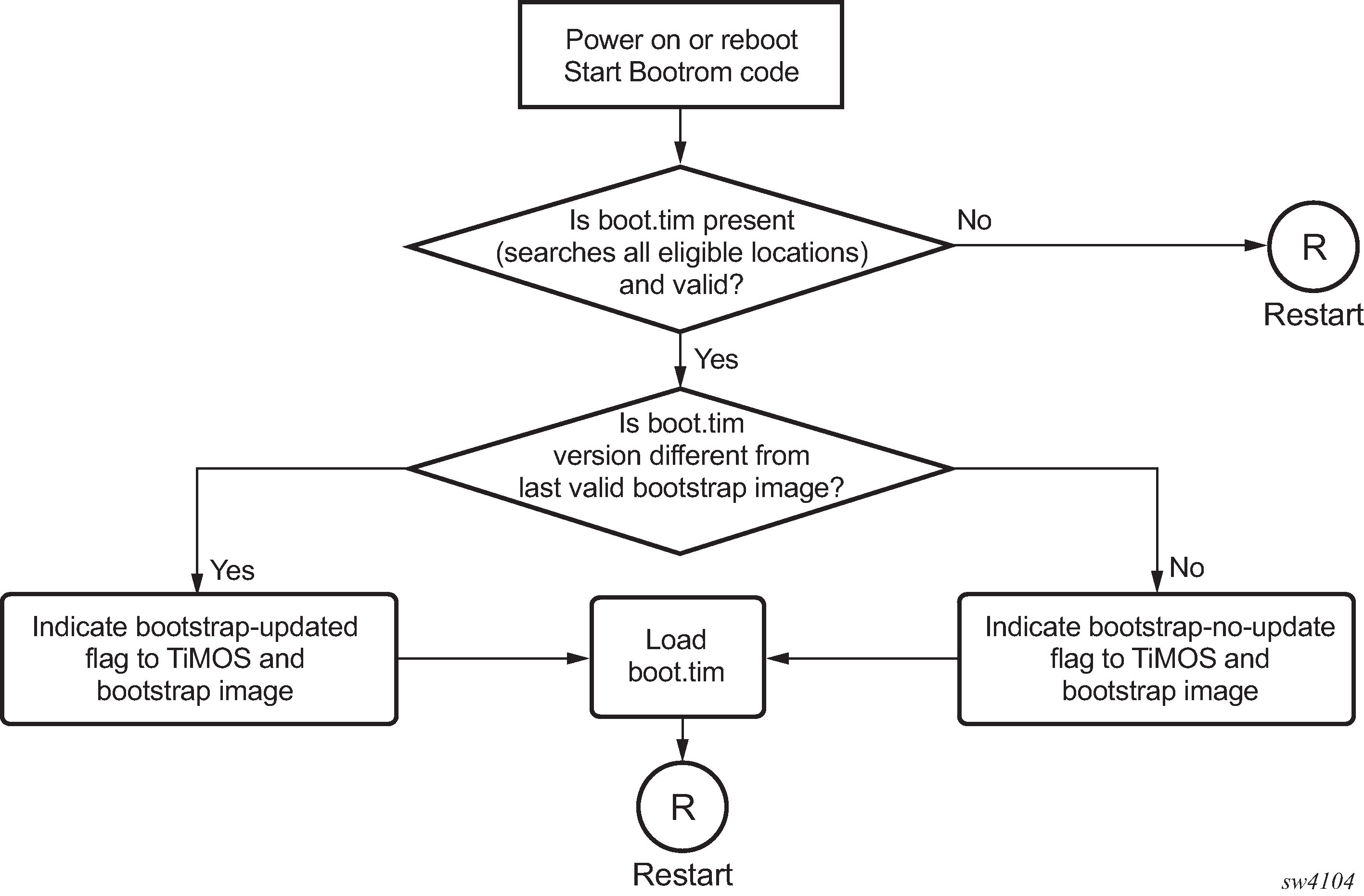 When the 7210 SAS device is powered on, the system executes the boot.tim file (also known as the boot loader or the bootstrap image) from the file system located on one of the storage media available on the 7210 SAS platform. The boot.tim file is the image that reads and executes the system initialization commands configured in the Boot Option File (BOF).