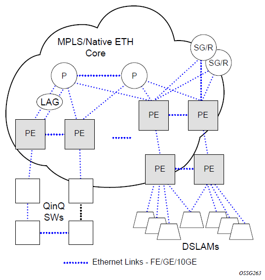 The following figure shows an MPLS network that uses Ethernet interfaces in the core or as an access/handoff interfaces to connect to different kind of Ethernet enabled devices such as service gateway/routers, QinQ switches DSLAMs or customer equipment.