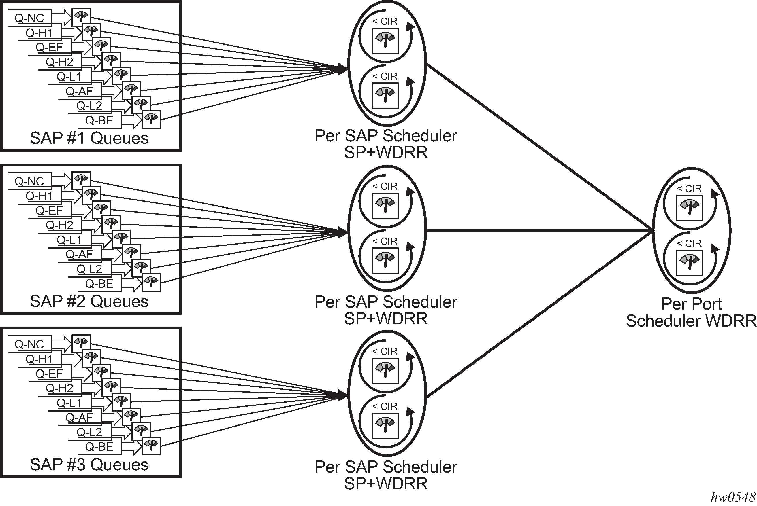 Each SAP has a per SAP scheduler which operates in SP + WDRR mode and an aggregate per SAP shaper (CIR/PIR). The per SAP scheduler distributes the available bandwidth to the configured strict and weighted SAP queues, using the configured mode and rates, in 2 passes - CIR loop and PIR loop