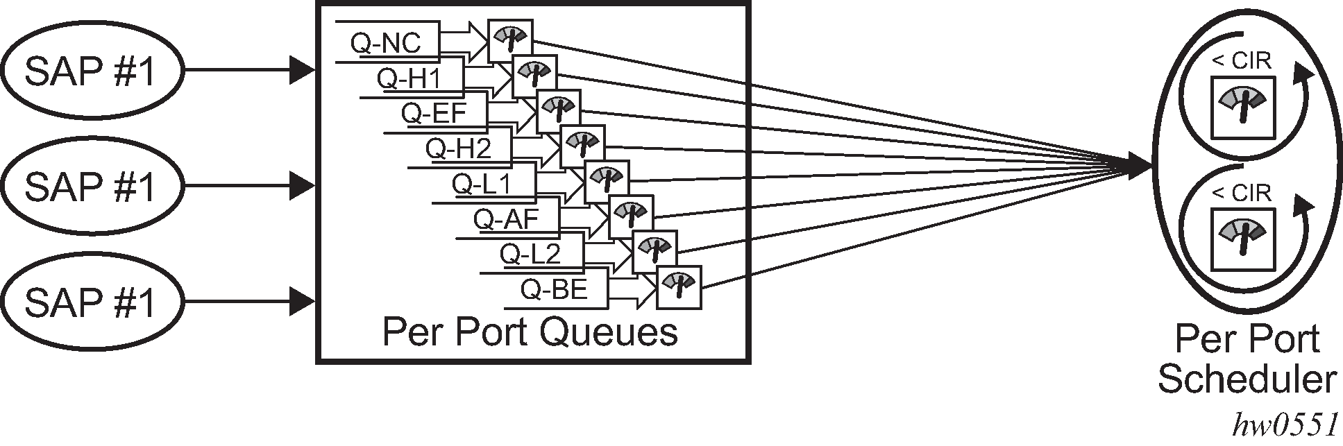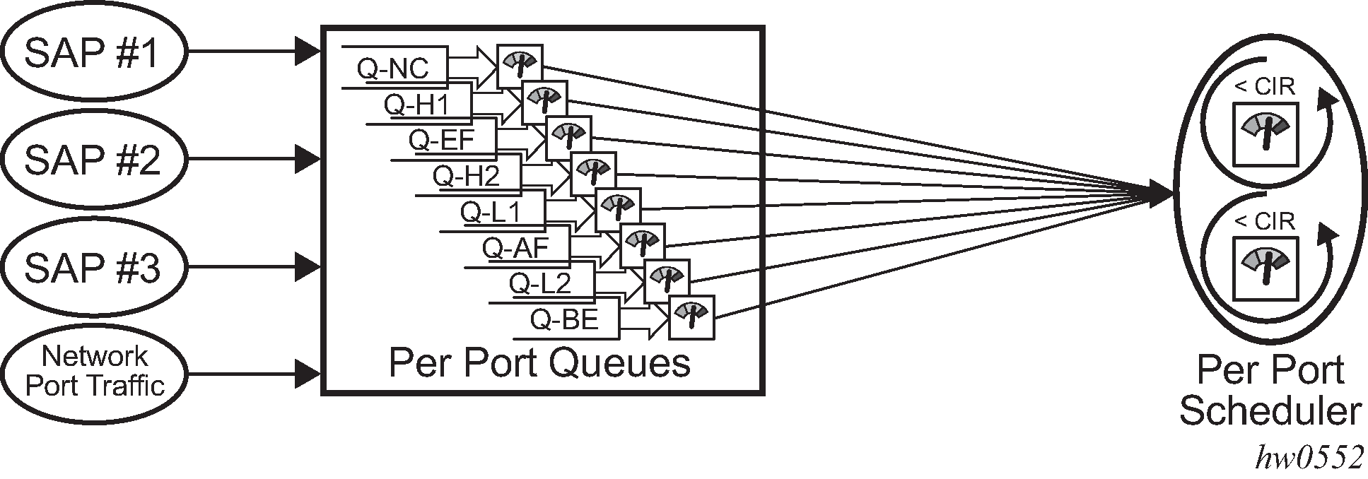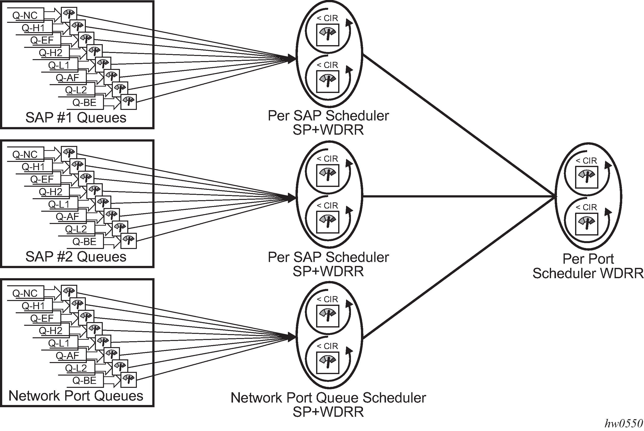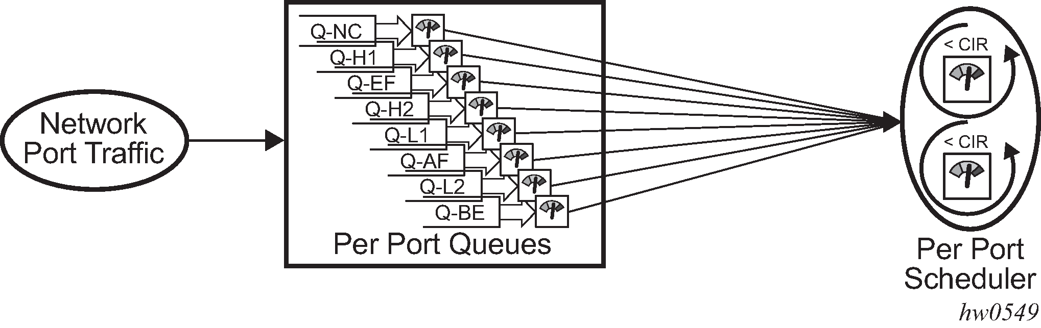 The scheduling behavior is very similar to the SAP-based queues on the access ports. That is, the network port queues used for network traffic are treated as another SAP node in the scheduling hierarchy.