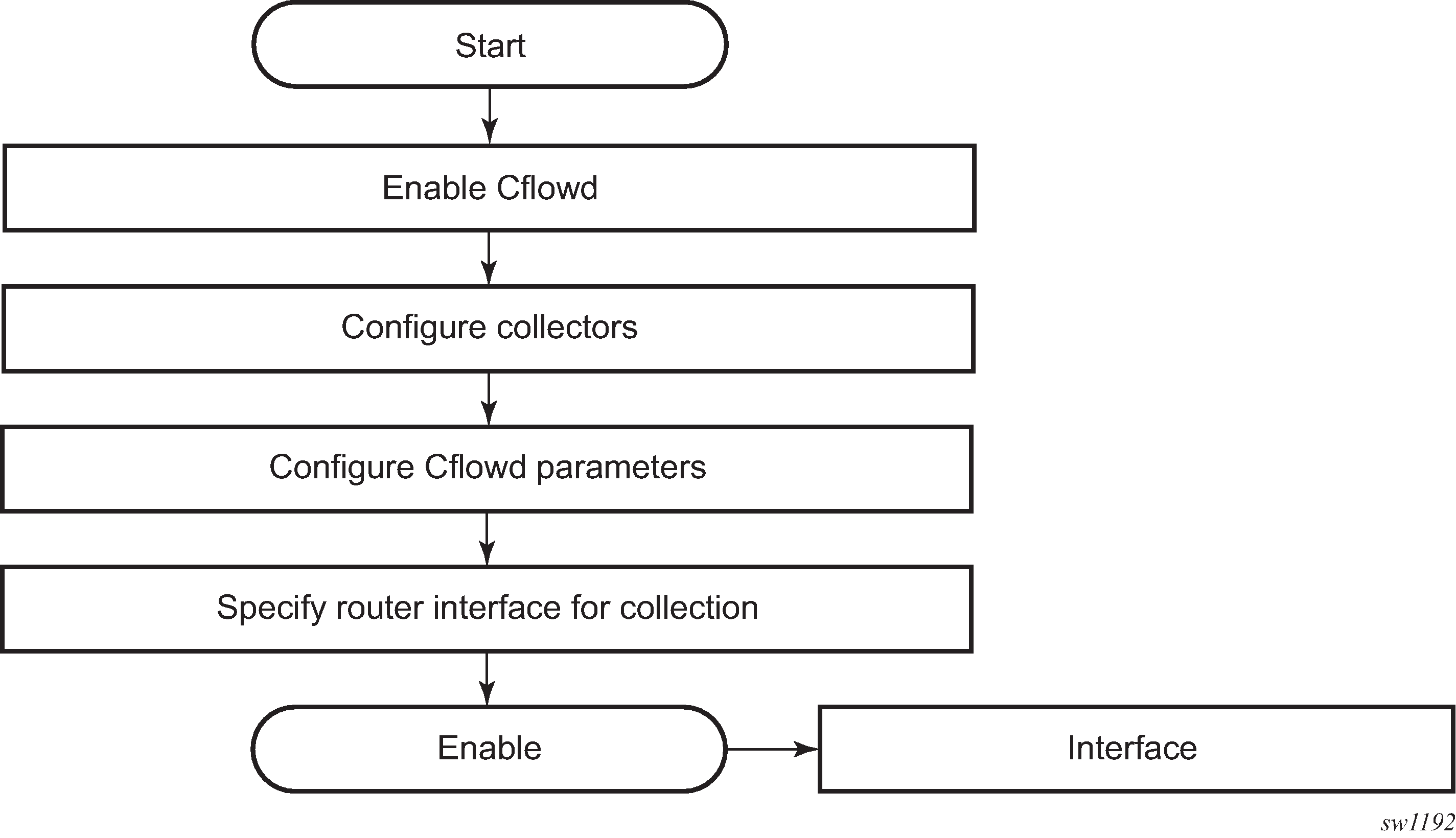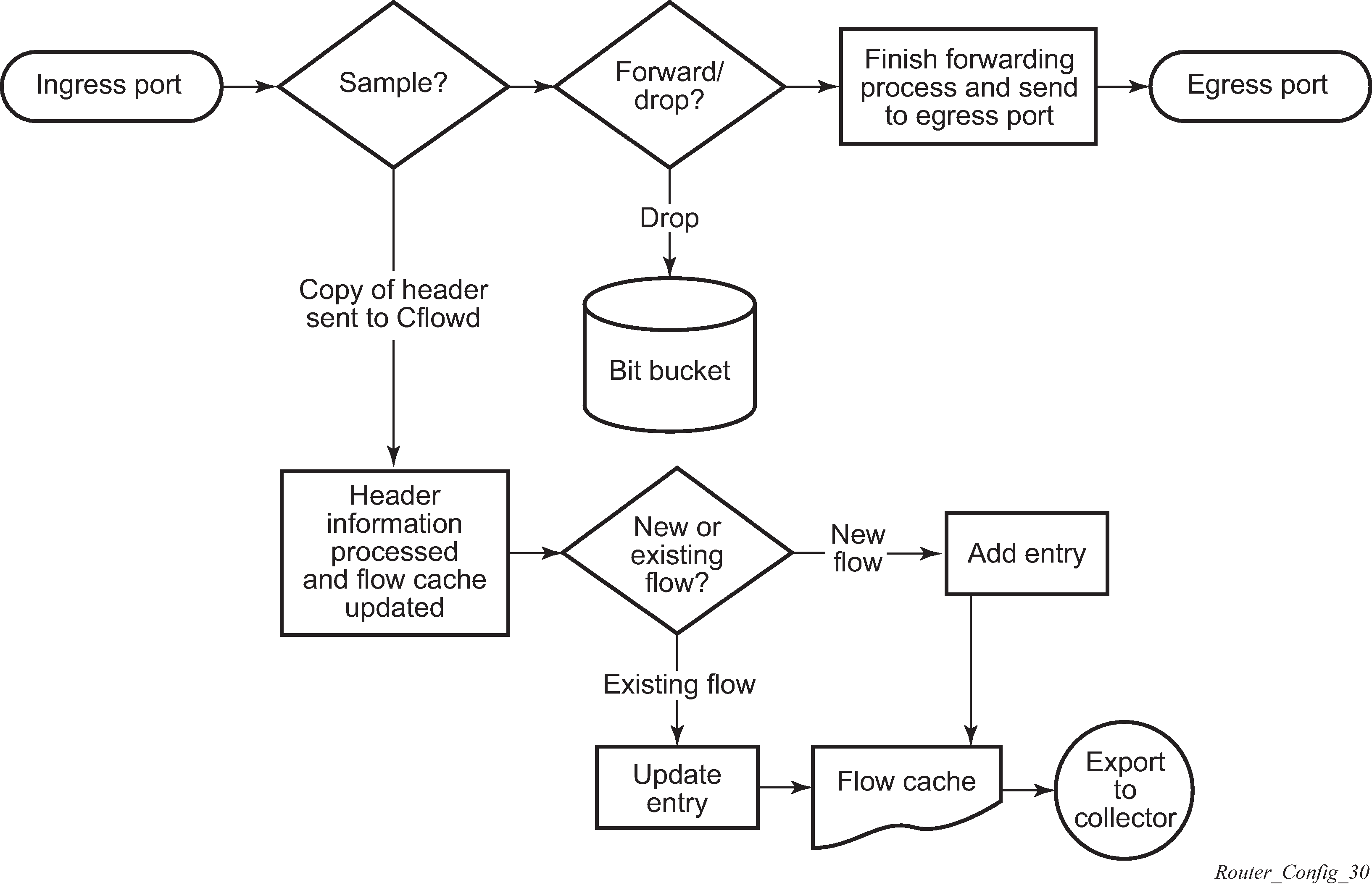 The following figure shows the basic operation of the cflowd feature. This sample flow only describes the basic cflowd operation overview and is not intended to specify implementation and support on the 7210 SAS.