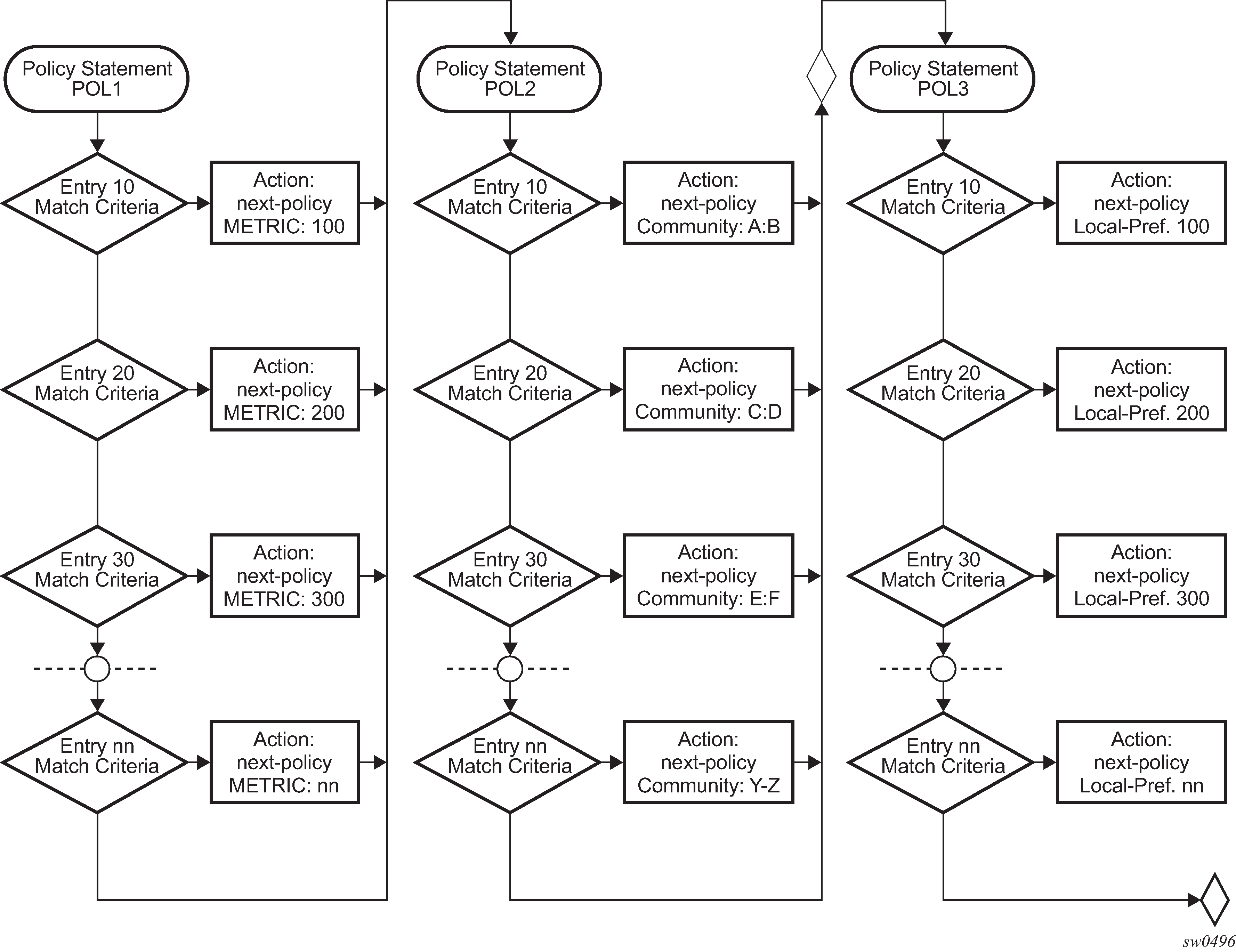 Sample output: show router policyThe show router policy command displays all configured route policies.
