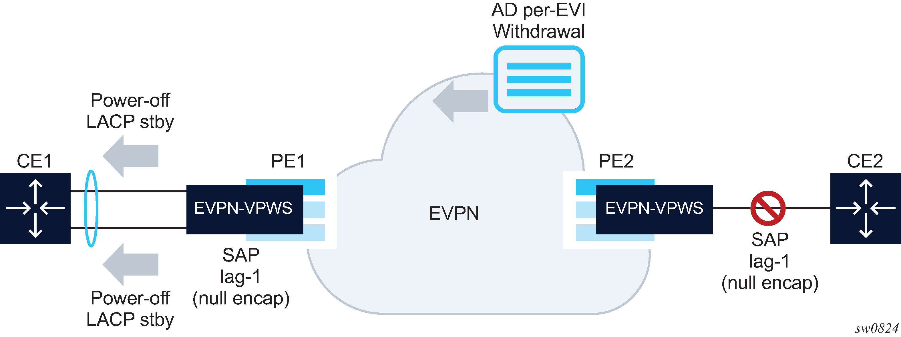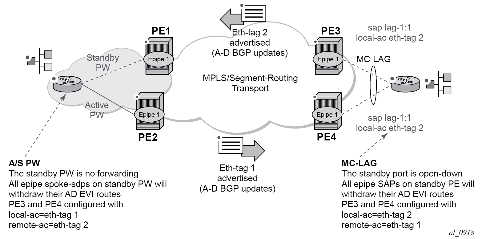 The MPLS network used by EVPN for E-LAN services can also be shared by E-Line services using EVPN in the control plane. EVPN for E-Line services (EVPN-VPWS) is a simplification of the RFC 7432 procedures, and is supported on the 7210 SAS in compliance with draft-ietf-bess-evpn-vpws.