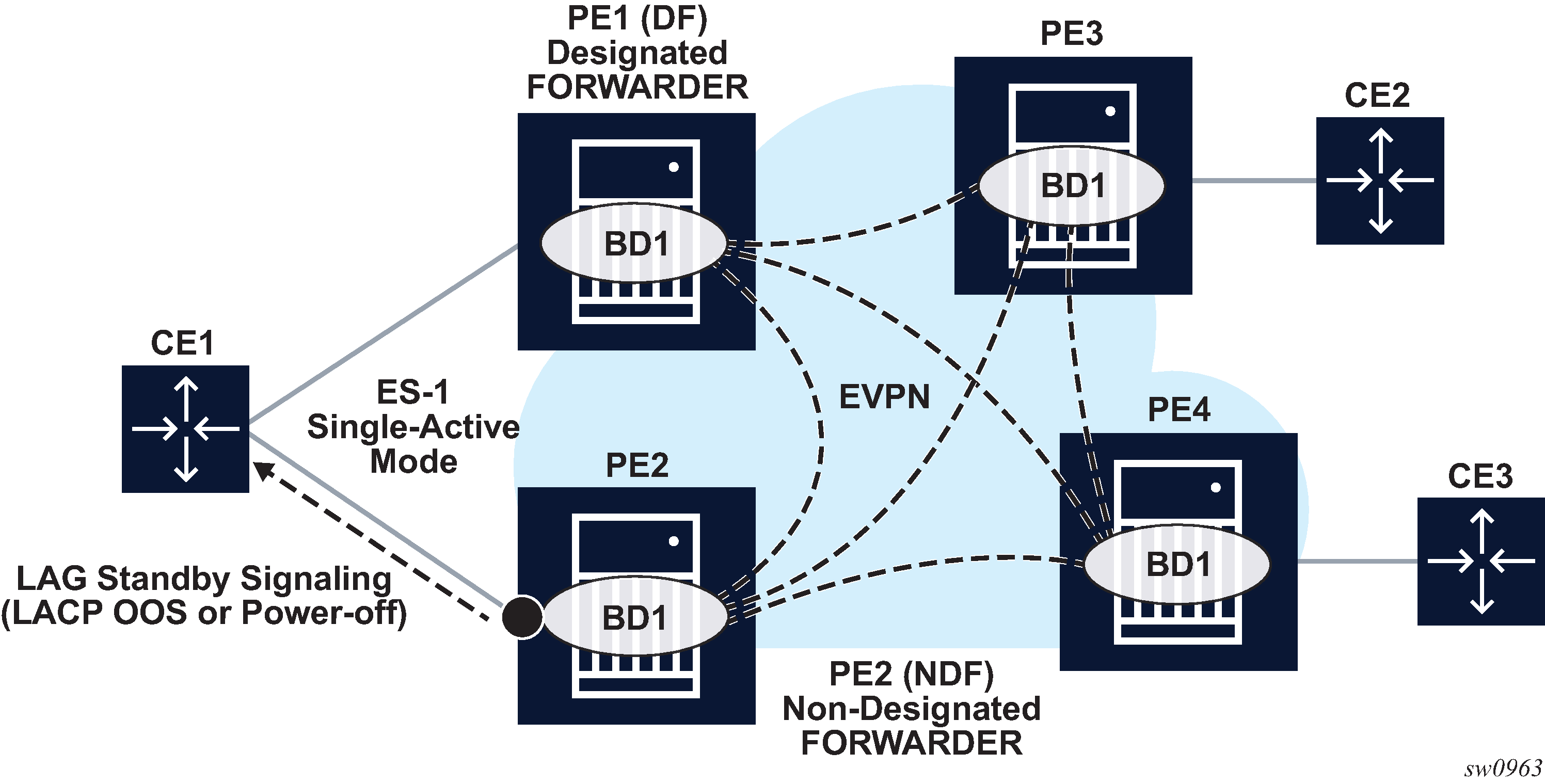 This includes the single-active bit (0 for all-active and 1 for single-active) and ESI label for all-active multi-homing split-horizon. The 7210 SAS always sets the single-active bit to ‟1”, as long as single-active is supported. In addition, 7210 SAS does not allocate and send the ESI label for single-active multi-homing.
