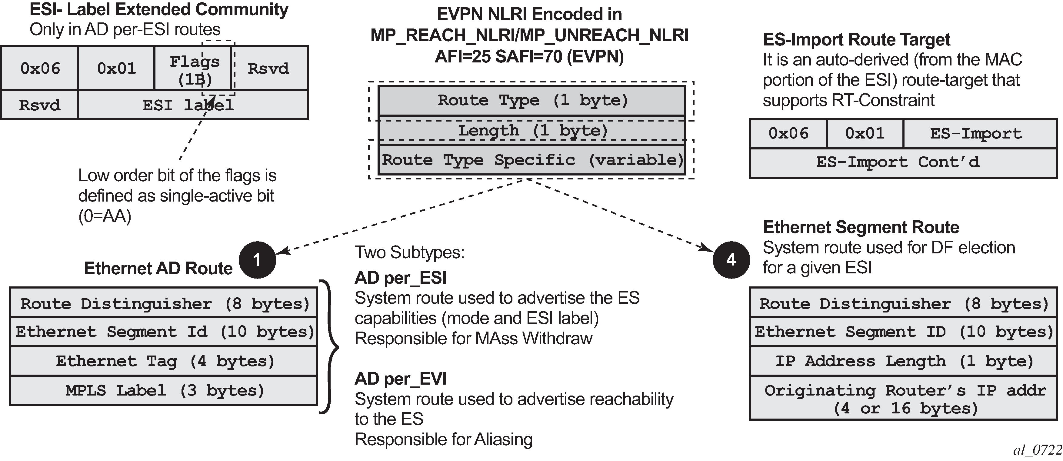 When EVPN multi-homing is enabled in the system, two additional routes are required. The following figure shows the fields in routes type 1 and 4 and their associated extended communities.