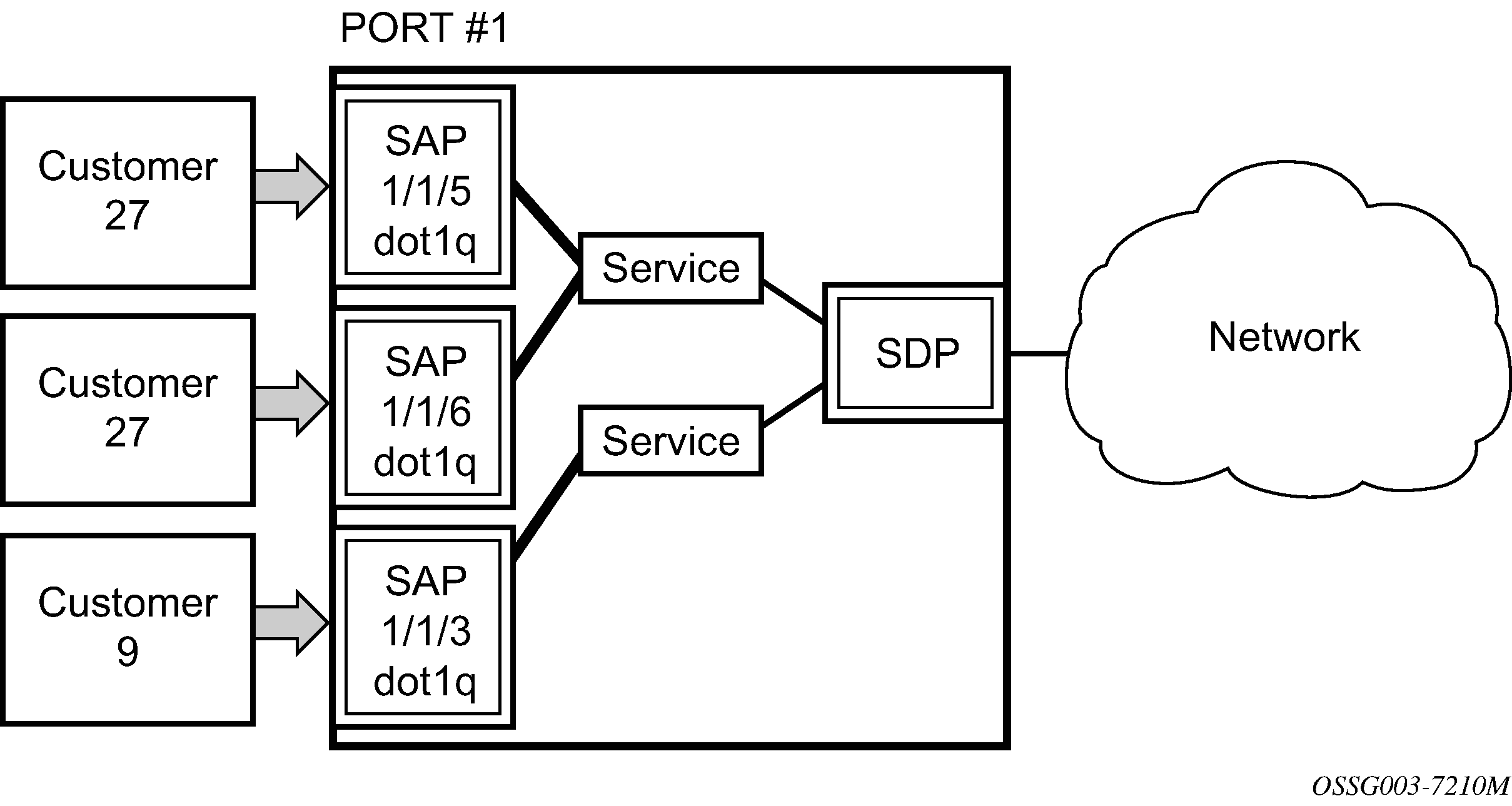 Supports multiple services for one customer or services for multiple customers (Multiple SAPs on a single port). The encapsulation ID used to distinguish an individual service is the VLAN ID in the IEEE 802.1Q header. For example, the port is connected to a Ethernet switch with multiple downstream customers.
