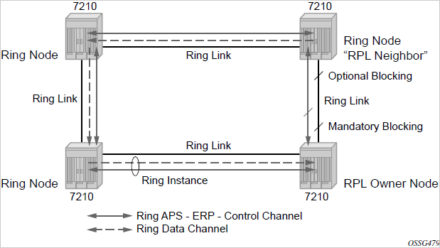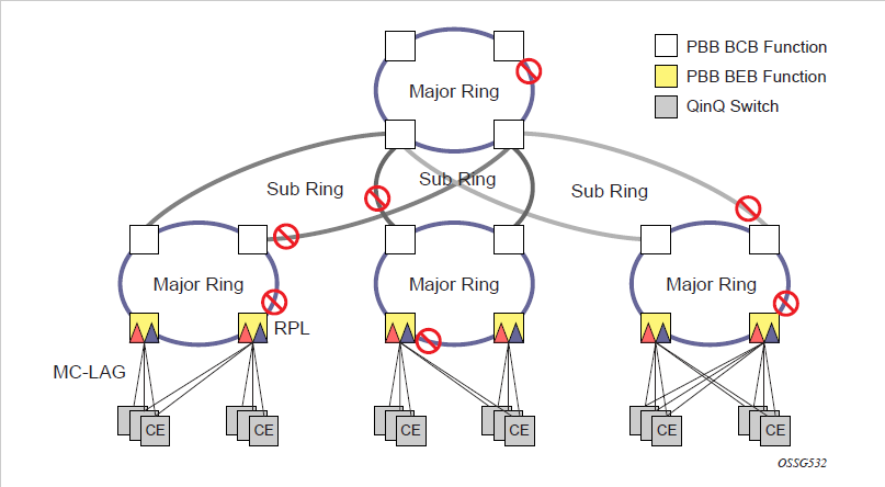 When a VPLS service with default QinQ SAPs on the ring ports is used for transit traffic in a ring deployment, users can use either G.8032 or M-VPLS with xSTP for ring protection. When using G.8032, the state of the default QinQ SAPs in the VPLS service can be managed using a separate G.8032 control instance.