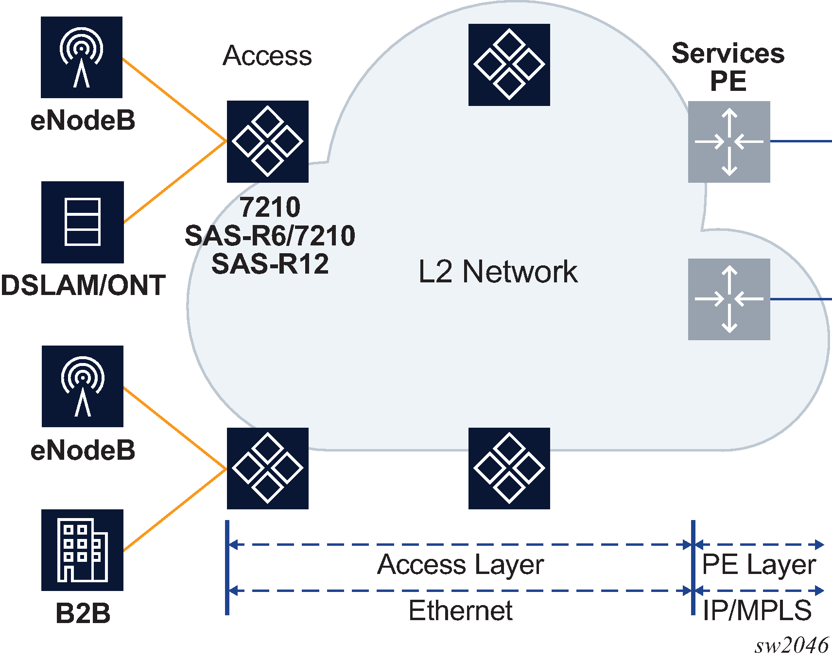 In the 7210 SAS-series routers, services can provide Layer 2/bridged service between a service access point (SAP) and another service access point (a SAP is where traffic enters and exits the service) on the same (local) router or another router (distributed). A distributed service spans more than one router.