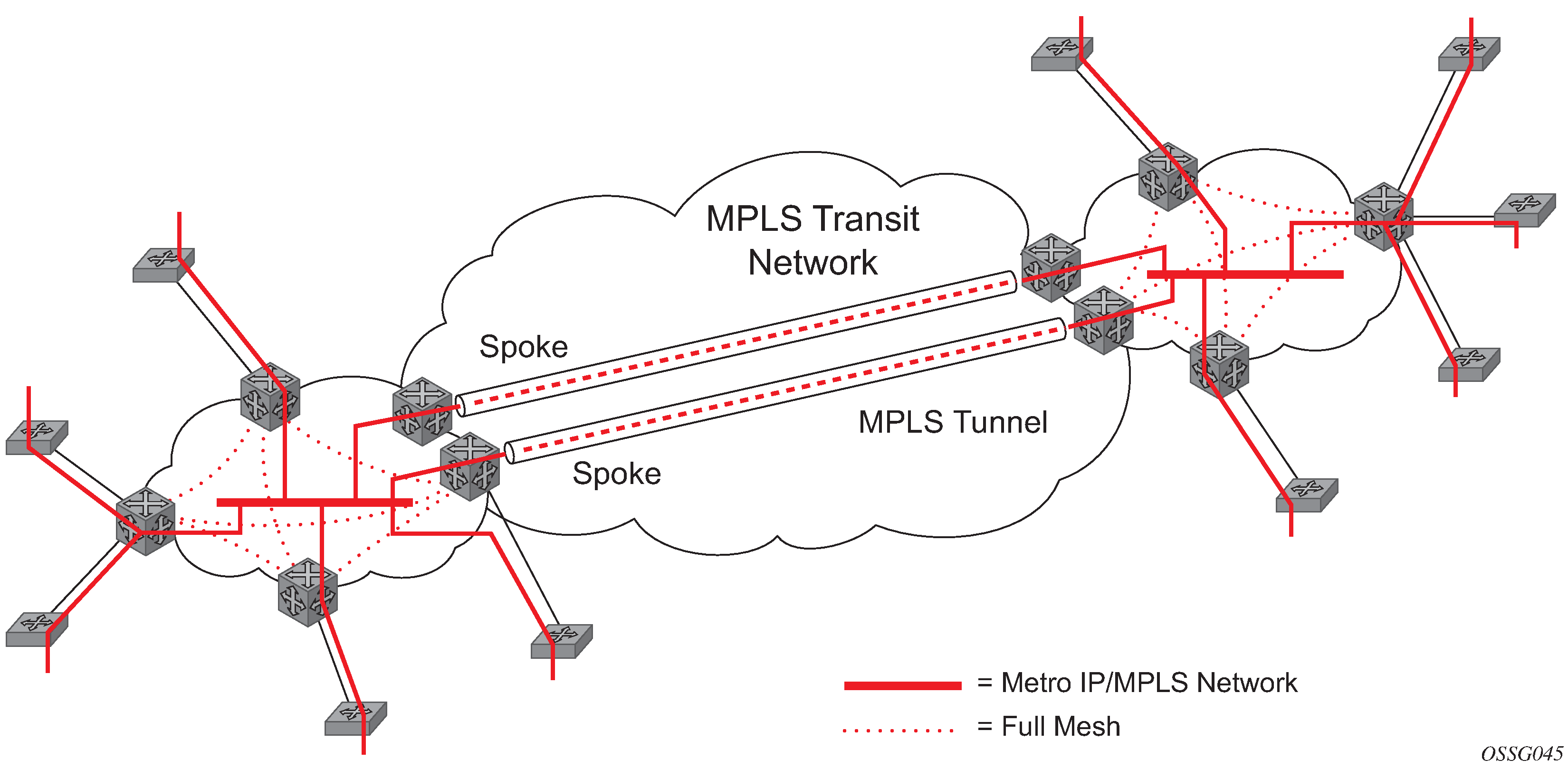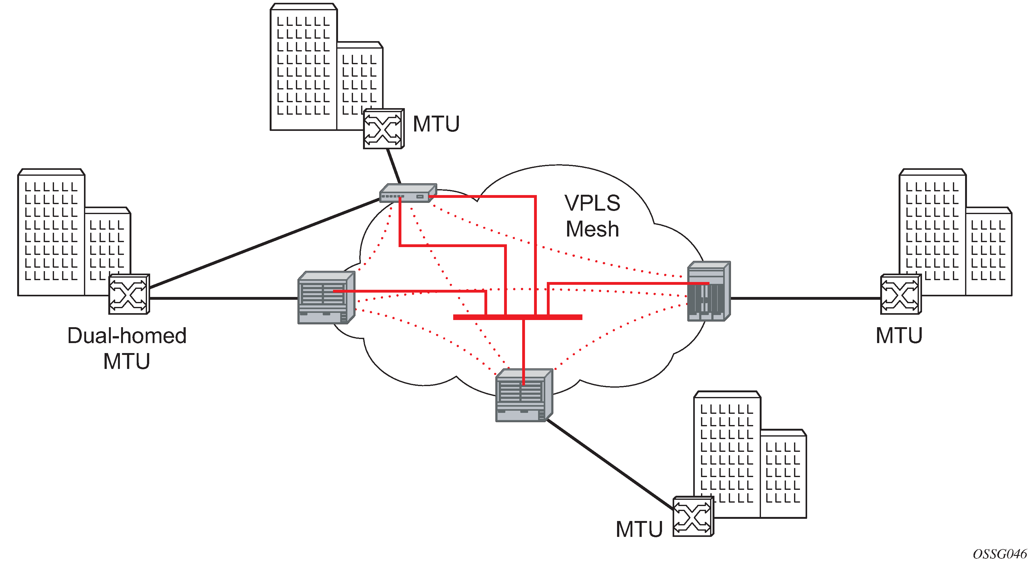 The VPLS architecture proposed in draft-ietf-ppvpn-vpls-ldp-0x.txt specifies the use of provider equipment (PE) that is capable of learning, bridging, and replication on a per-VPLS basis. The PE routers that participate in the service are connected using MPLS Label Switched Path (LSP) tunnels in a full-mesh composed of mesh SDPs or based on an LSP hierarchy (Hierarchical VPLS (H-VPLS)) composed of mesh SDPs and spoke SDPs. The 7210 SAS supports only H-VPLS.