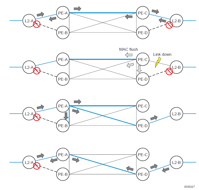 If the destination MAC address has not been learned, 7210 floods the packet to spoke-SDPs that are participating in the service.