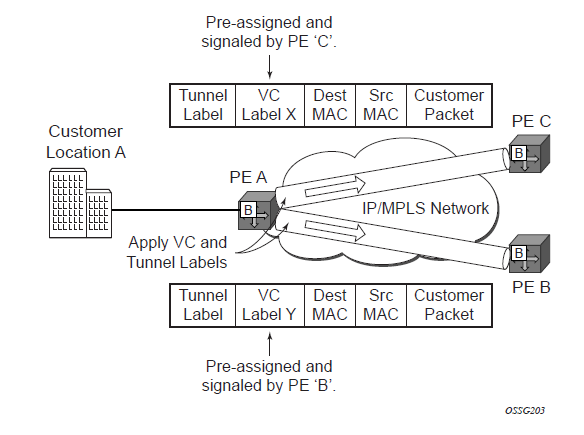 If the destination MAC address has already been learned by 7210, an existing entry in the FIB table identifies the far-end PE-Router and the service VC-label (inner label) to be used before sending the packet to PE-Router-A.