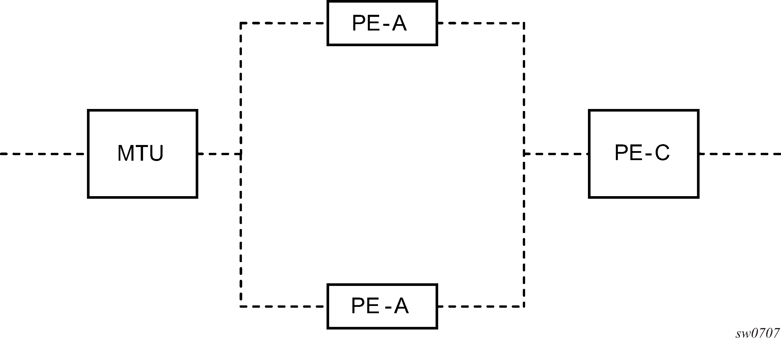 This section provides an example of VPLS processing of a customer packet sent across the network from site-A, which is connected to PE-Router-A through a 7210 SAS to site-C, which is connected through 7210 SAS to PE-Router-C (shown in the following figure) in an H-VPLS configuration. This section does not describe the processing on the PE routers, but only on 7210 SAS routers: