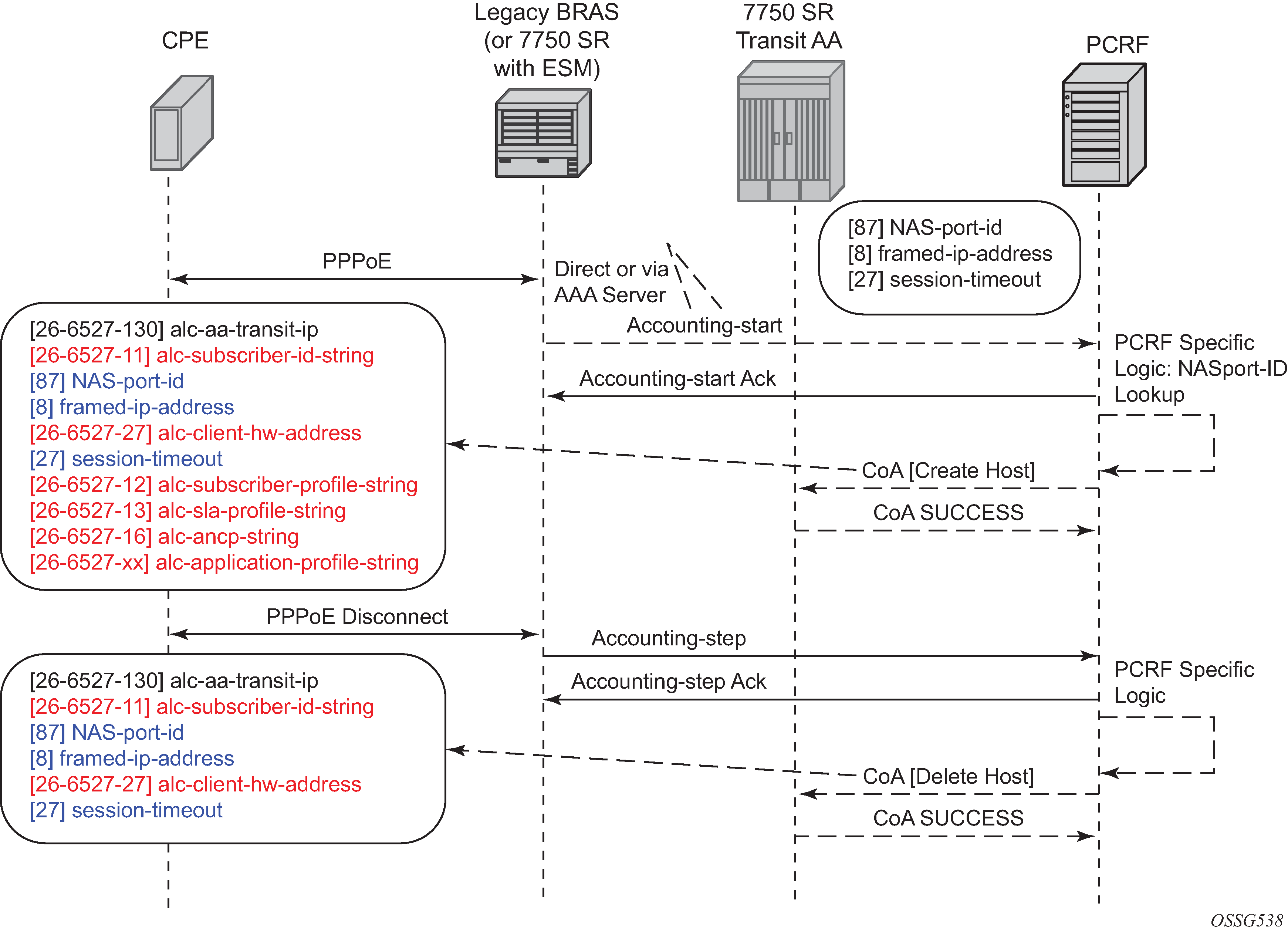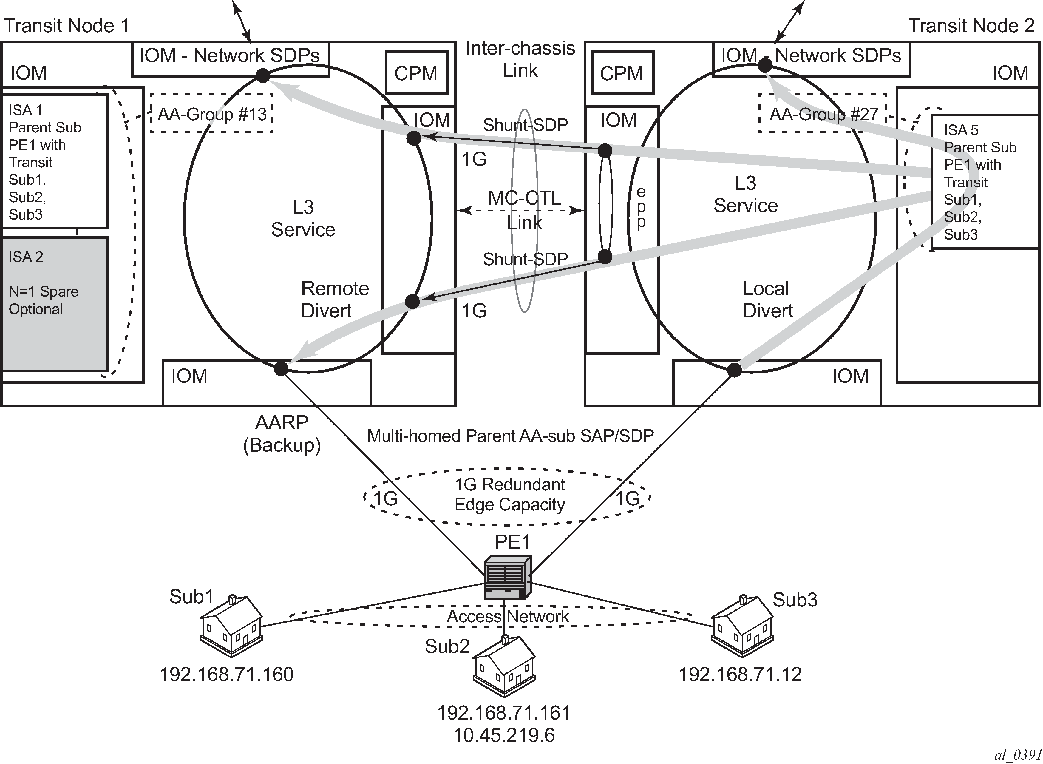There are residential topologies where it is not possible or practical to distribute ISAs into the same network elements that run ESM, including for legacy edge BRASs that still need AA policy (reporting and control) for the same Internet services, and which needs to be aligned and consistent with the ESM AA policy. This is supported using transit AA subscribers, typically in the first routed element behind the legacy edge.