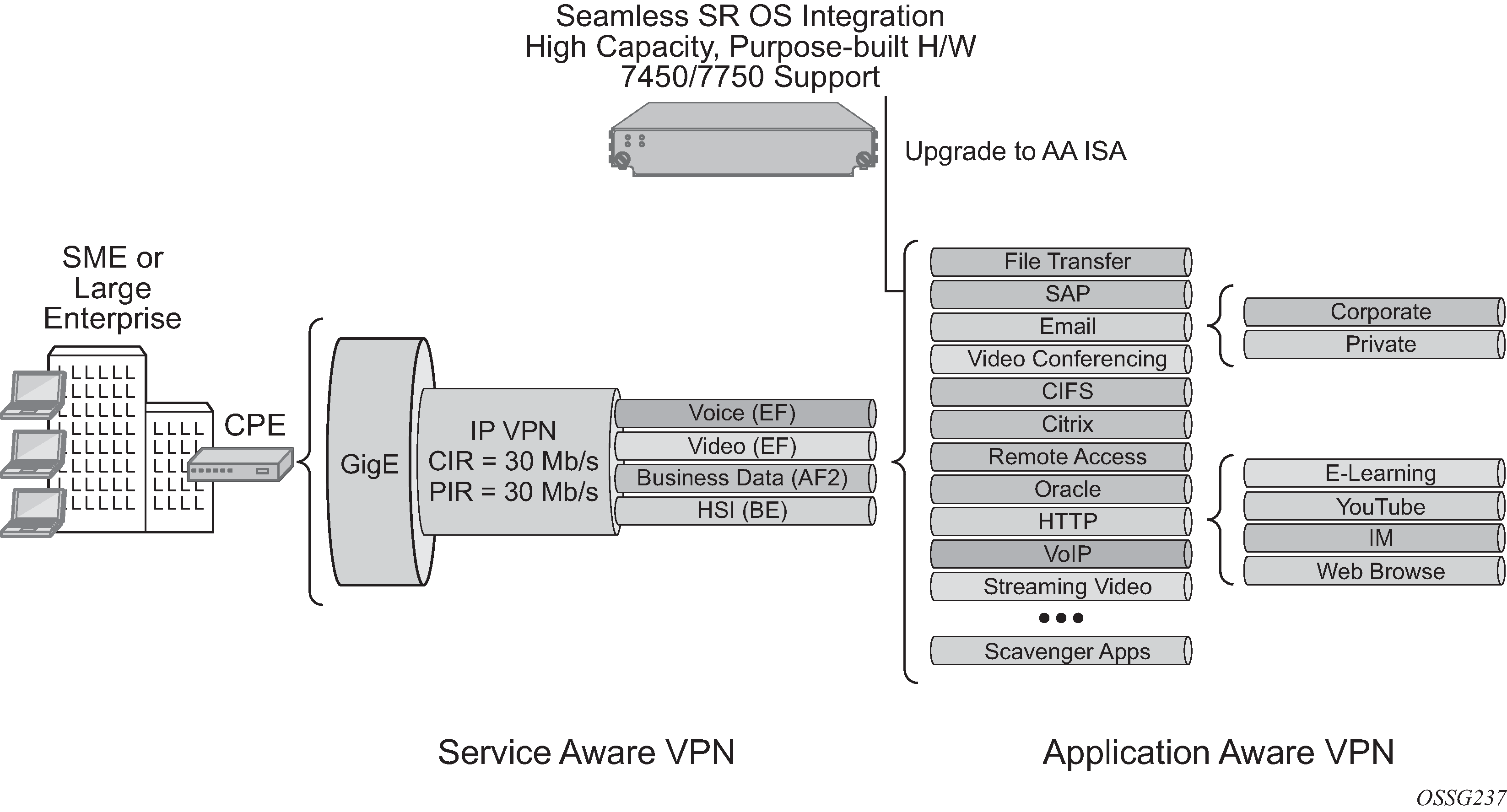 Integrating Layer 4 to Layer 7 application policy with the 7750 SR or 7450 ESS subscriber edge policy context is the primary solution to address both residential broadband edge and Layer 2 or Layer 3 application aware business VPN. Placement of Layer 4 to Layer 7 analysis at the distributed subscriber edge policy point simplifies AA deployments in the following ways: