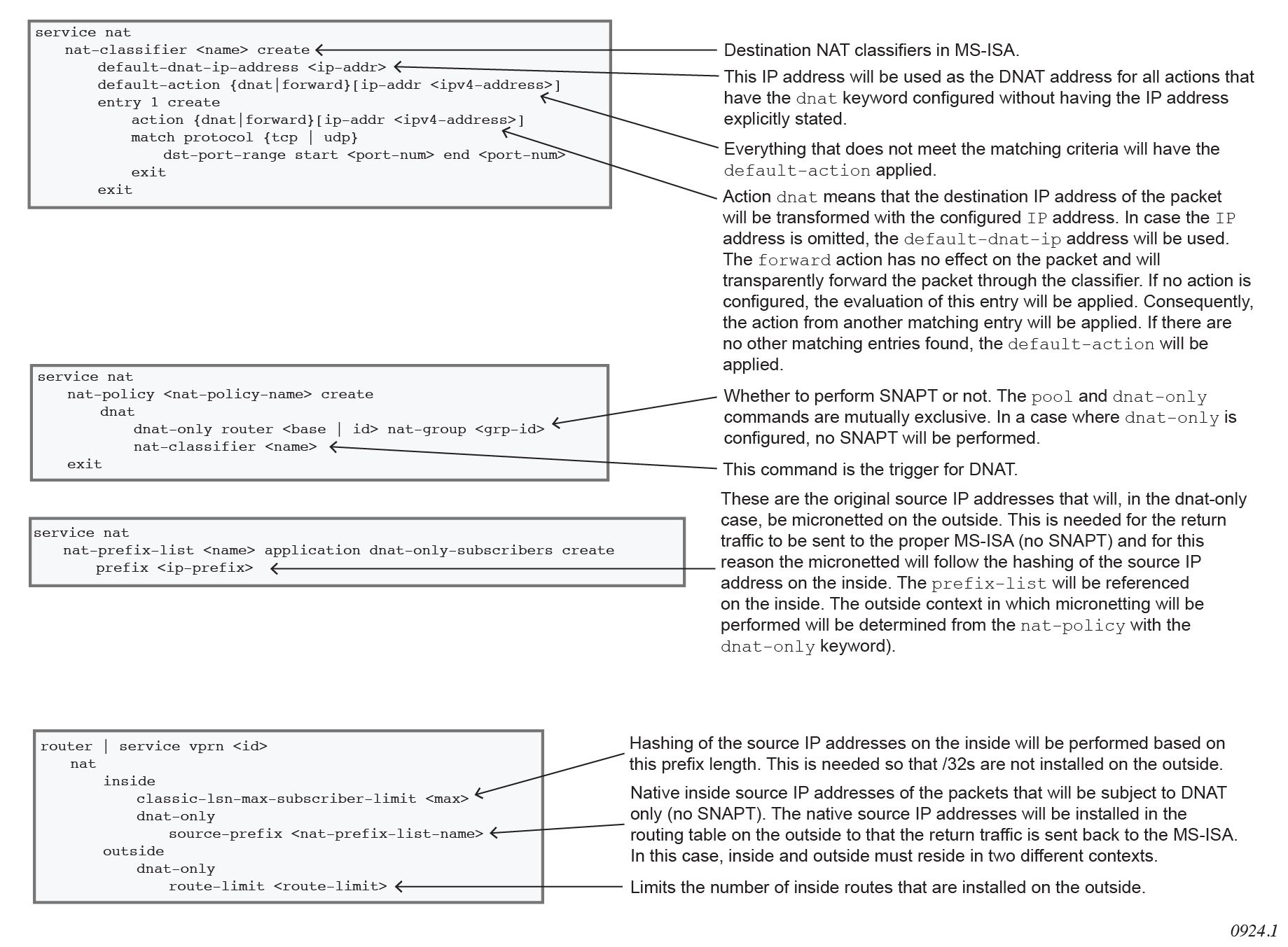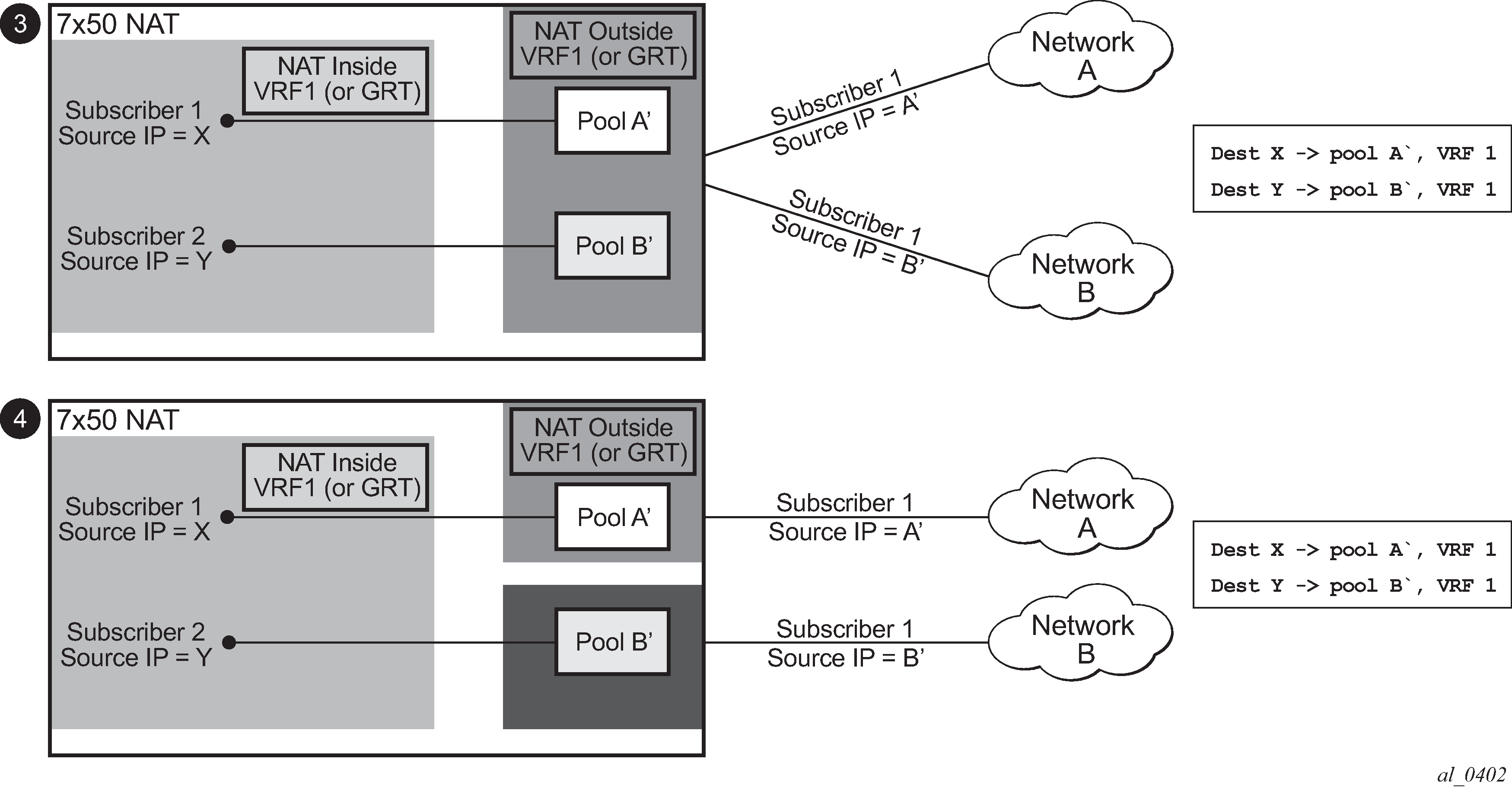 In NAT terminology, a NAT subscriber is an inside entity whose true identity is hidden from the outside. There are a few types of NAT implementation in 7750 SR and subscribers for each implementation are defined as follows:
