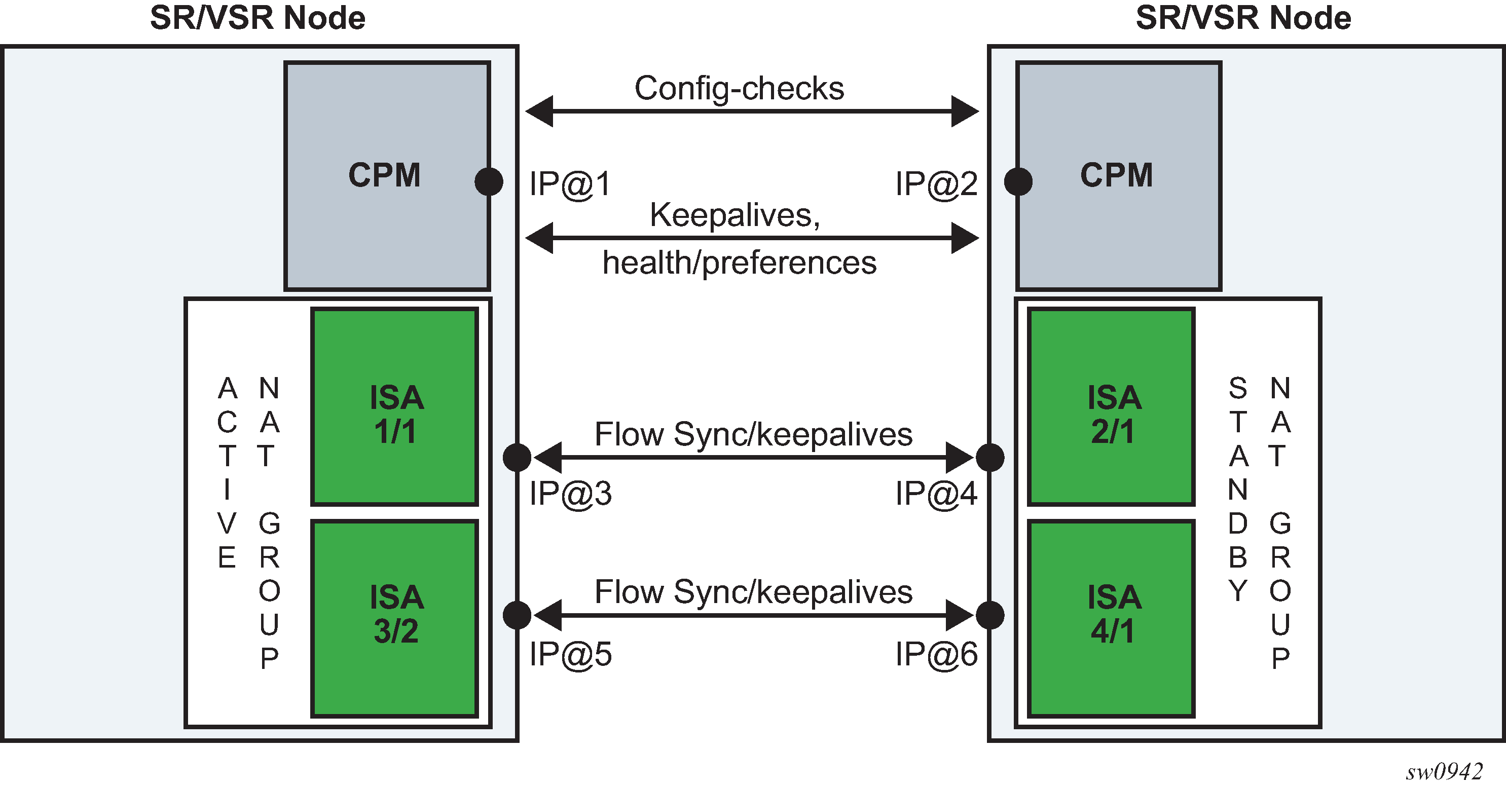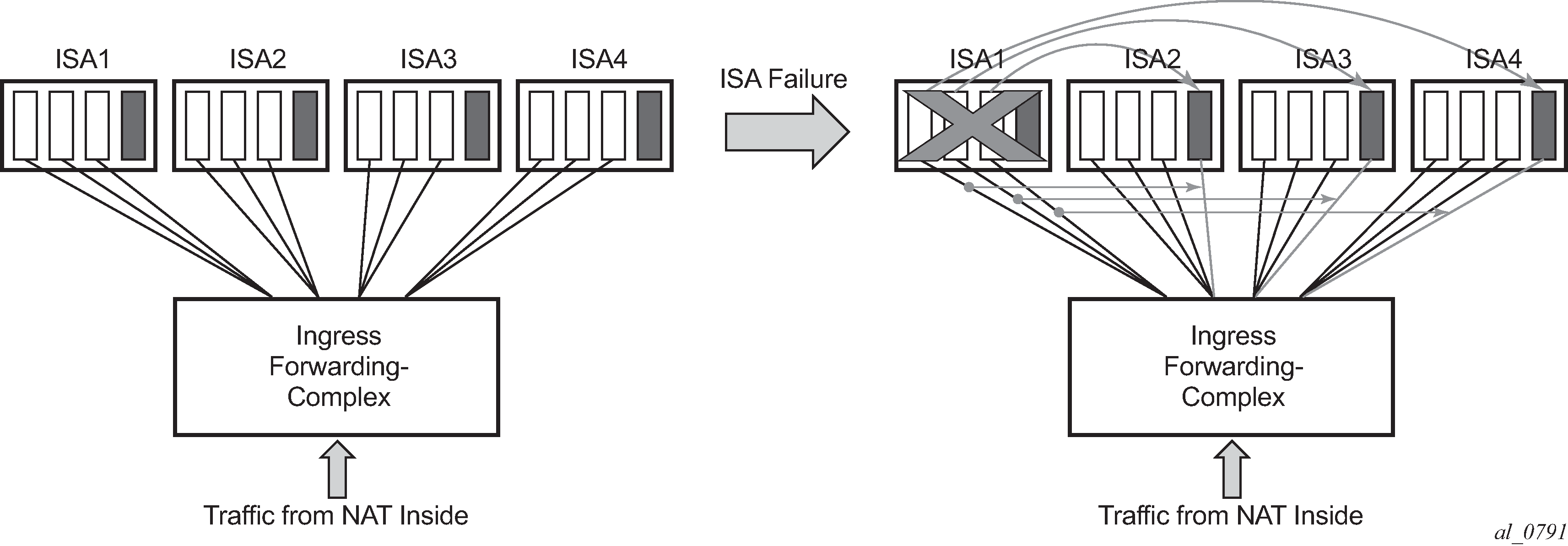 NAT traffic in SR OS is distributed over ISAs and ESAs within each NAT group. This allows NAT capacity to grow incrementally by adding more ISAs and ESAs to the system, while each ISA or ESA participates equally in load sharing.