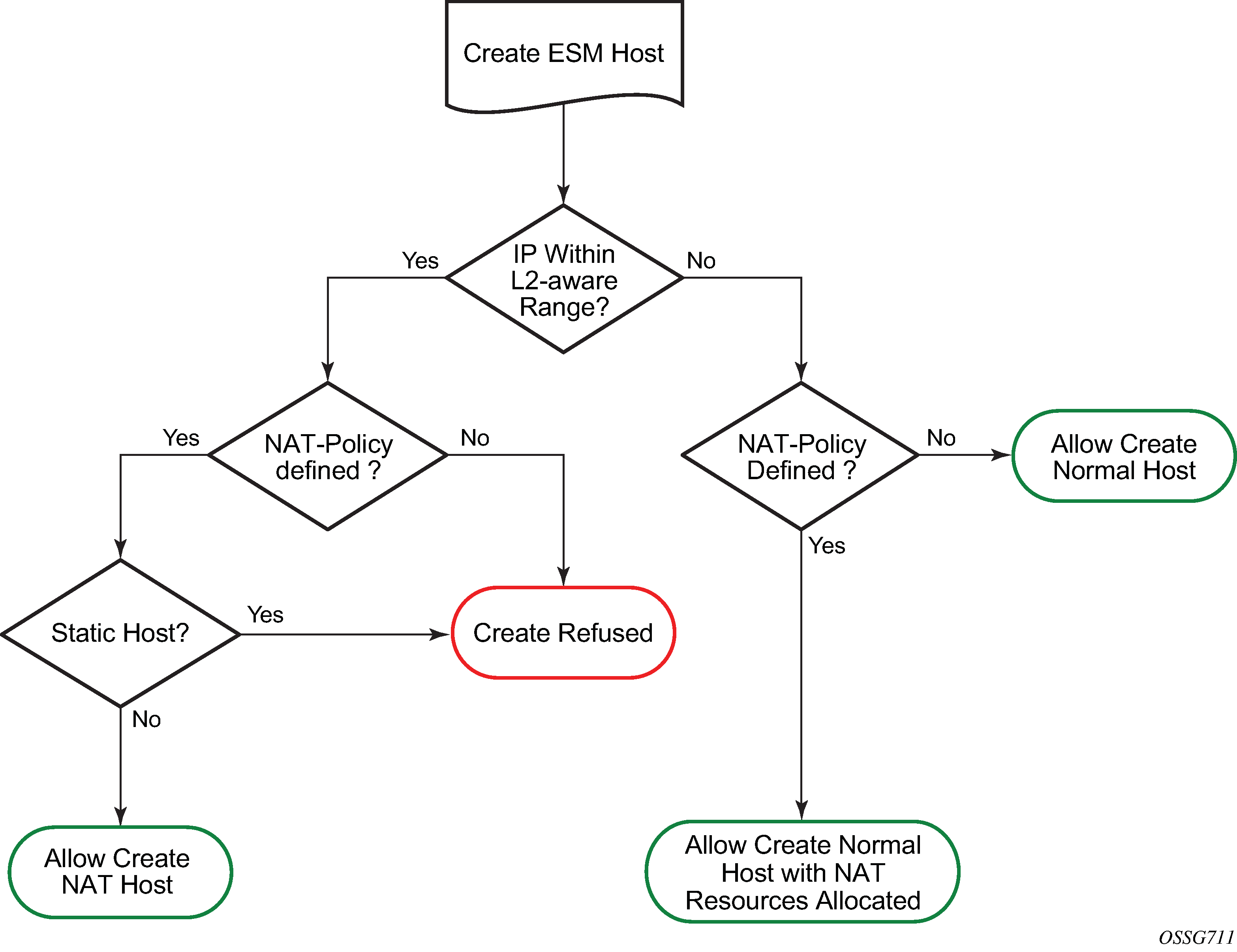 In the context of 7750 SR platform combines Enhanced Subscriber Management (ESM) subscriber-id and inside IP address to perform translation into a unique outside IP address and outside port. This is in contrast with classical NAT technique where only inside IP is considered for address translations. Because the subscriber-id alone is sufficient to make the address translation unique, Layer 2–aware NAT allows many ESM subscribers to share the same inside IP address. The scalability, performance and reliability requirements are the same as in LSN.