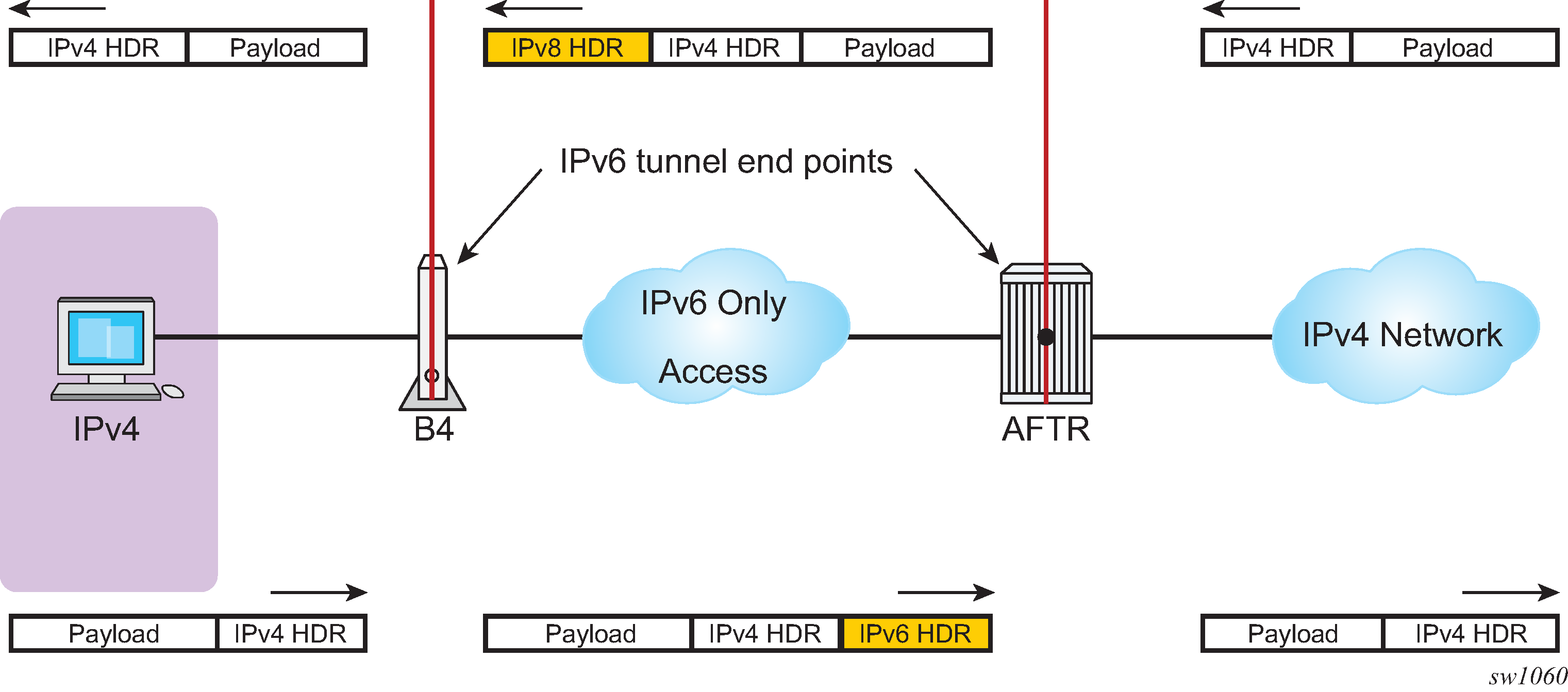 These two modes both perform source address and port translation as commonly deployed for shared Internet access. The 7750 SR with NAT is used to provide consumer broadband or business Internet customers access to IPv4 Internet resources with a shared pool of IPv4 addresses, such as may occur around the forecast IPv4 exhaustion. During this time it, is expected that native IPv6 services are still growing and a significant amount of Internet content remains IPv4.