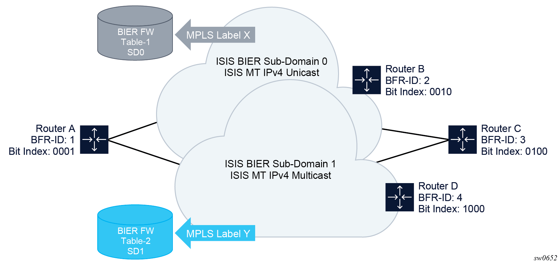 A BIER domain is an IGP area, and sub-domains are the different topologies within that area. In IS-IS and OSPF, each topology must also have its own sub-domain ID. For example, in IS-IS a sub-domain is an IS-IS multitopology. SR OS supports two sub-domains in IS-IS: IPv4-multicast and IPv4-unicast MTs. A sub-domain creates the least traffic engineering in a BIER domain. A user can use separate L3 interfaces into IPv4-unicast MT and a set of disjointed interfaces into the IPv4-multicast MT. This creates separation and traffic engineering for different multicast streams.