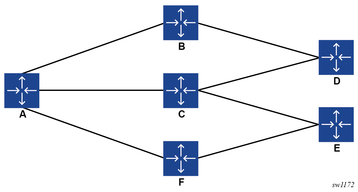 For example, in Topology example 1, from the point of view of A, both D and E are reachable through C. C is the next-hop for both D and E and can have a single protection next-hop, either B or F. If B is chosen as the protection next hop, for an LFA, the packet is forwarded to B for both D and E. B is not on the Shortest Path First (SPF) path to E and not the correct LFA, so an LFA for F is not possible in this network topology.