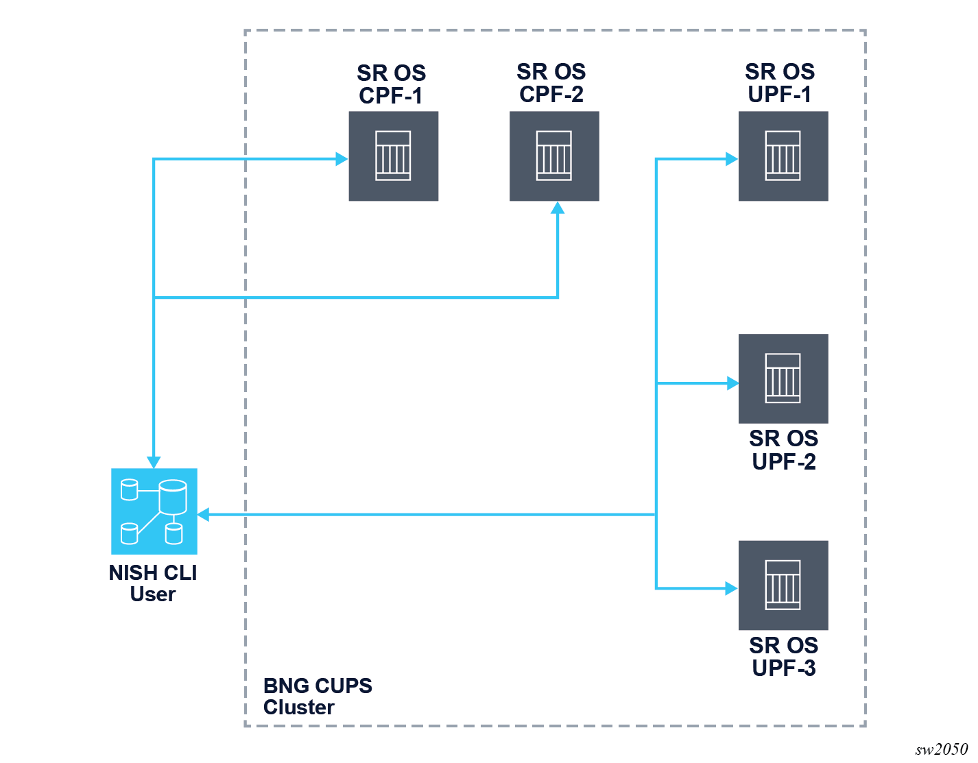 For this type of CUPS deployment, the Network Interface Shell (NISH) solution for Linux platforms provides efficient remote control of the SR OS MD-CLI, by enabling management of multiple nodes that are running different versions of SR OS from the same MD-CLI shell.