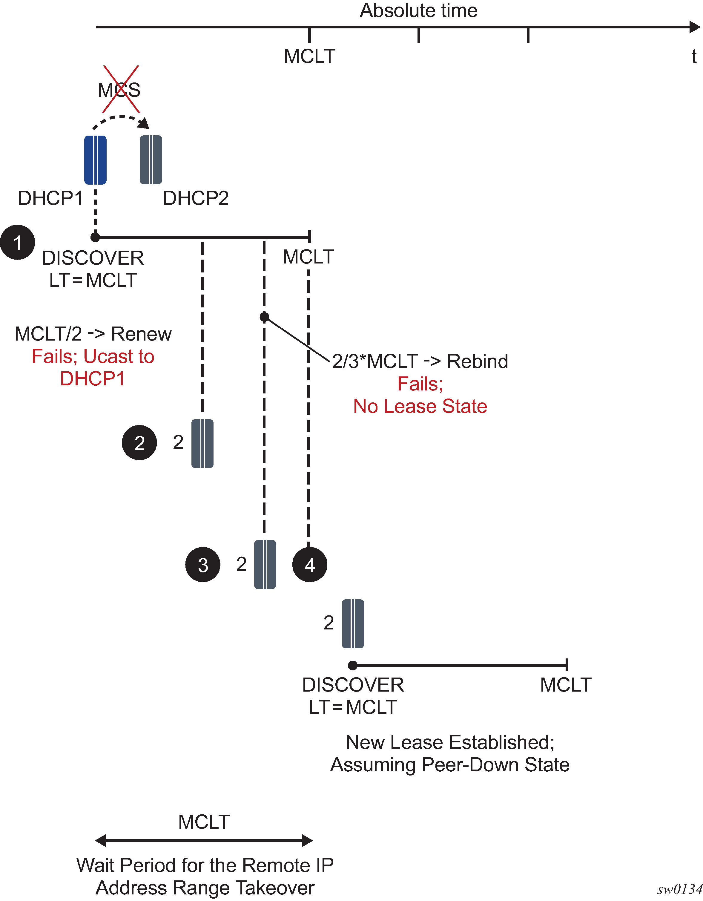 One artifact of this behavior (IP address assignment in local DHCP pools is synchronized through PPPoX clients and not by DHCP server synchronization mechanism) is that during the node boot, the DHCP server must wait for the completion of PPPoX subscriber synchronization by MCS so that it learns which addresses and prefixes are already allocated on the peering node. Because the DHCP server can theoretically start assigning IP addresses before the PPPoX sync is completed, a duplicate address assignment may occur. For example, an IP address lease can be granted by DHCP local pools while PPPoX sync is still in progress. After the PPPoX sync is completed, the DHCP server may discover that the granted IP lease has already been allocated by the peering node. The most recent lease is kept and the other is removed from both systems. To prevent this scenario, a configurable timer can be set to an arbitrary value that renders sub-if non-operational until the timer expires. The purpose of this timer is to allow the PPPoX sync to complete before subscribers under the sub-intf can be served.