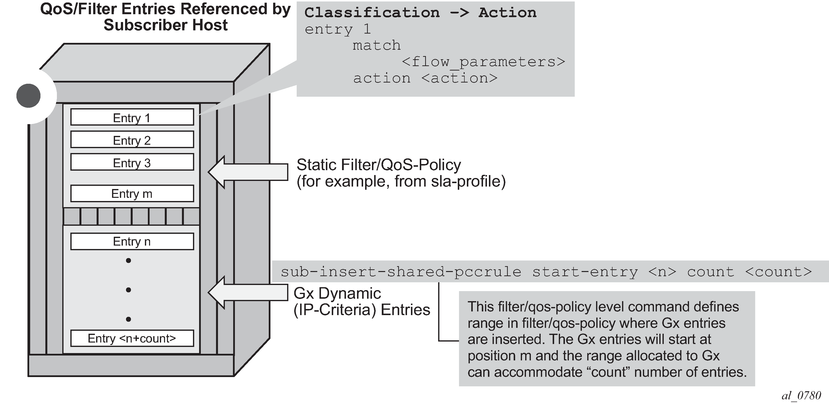 Gx flows are similar to dynamically created filter or ip-criteria (QoS) entries and are inserted within the entry range configured for the base filter/qos-policy.
