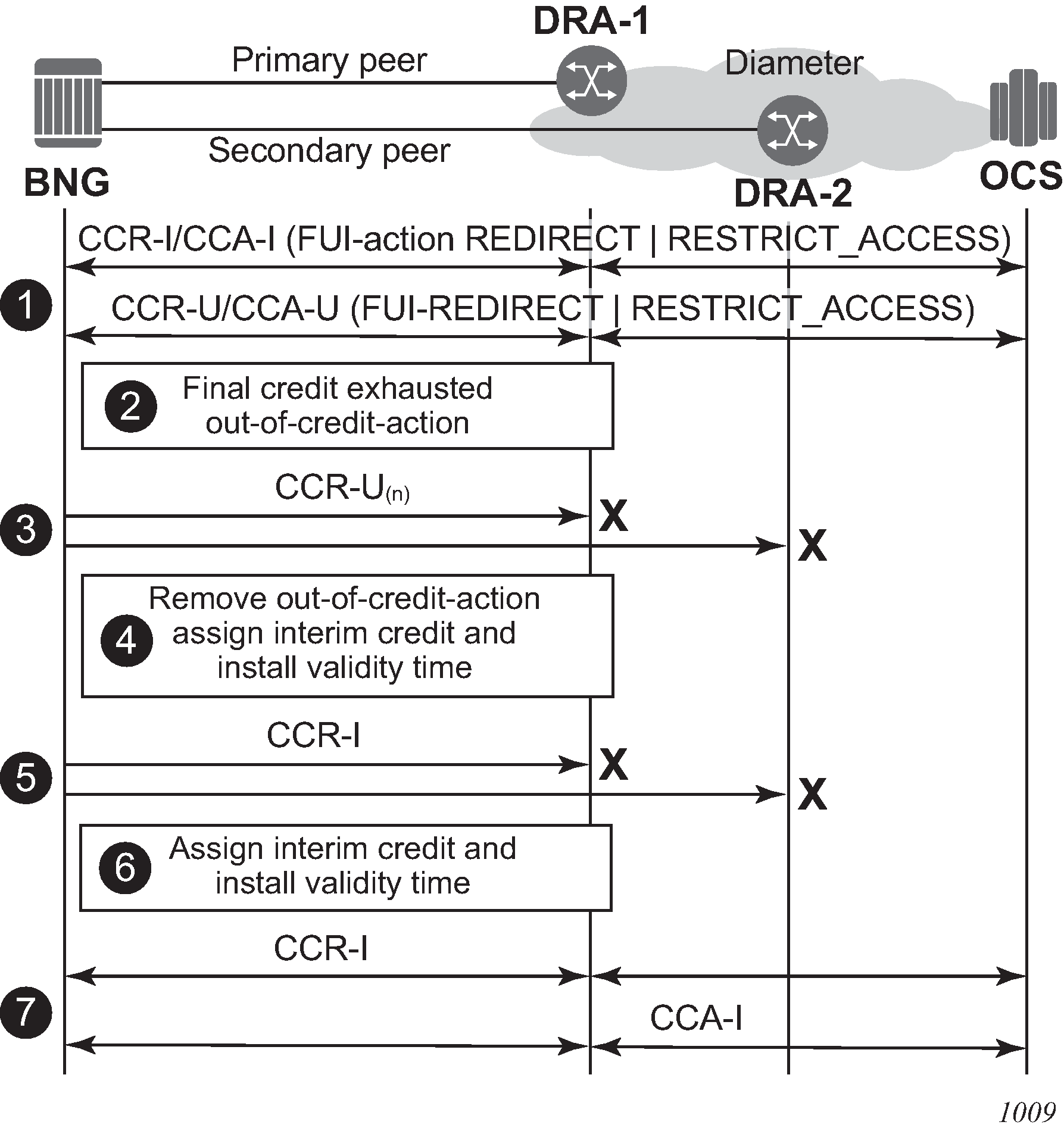 Two redundant Diameter SR nodes appear as a single Diameter entity, while maintaining a single peering connection with each network peer (in other words, only one BNG in the pair forms a peering connection with a Diameter peer on the network side). With this configuration, each network node (agents and servers) maintains a single, unambiguous path toward the pair of redundant SR nodes. The SR node selected to maintain this peering connection is chosen through the Multi-Chassis Synchronization (MCS) protocol that runs between the two nodes. The decision about which node opens the peering connection is made on a per-peer basis, which means that the networks peering connections can be distributed over the pair of redundant SR nodes.
