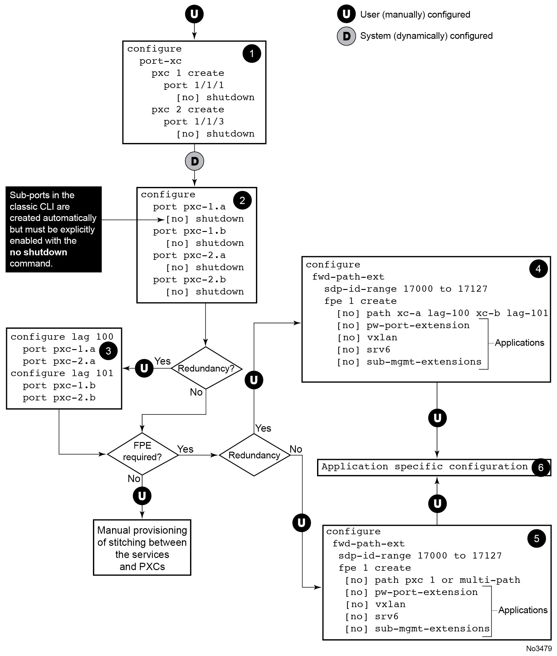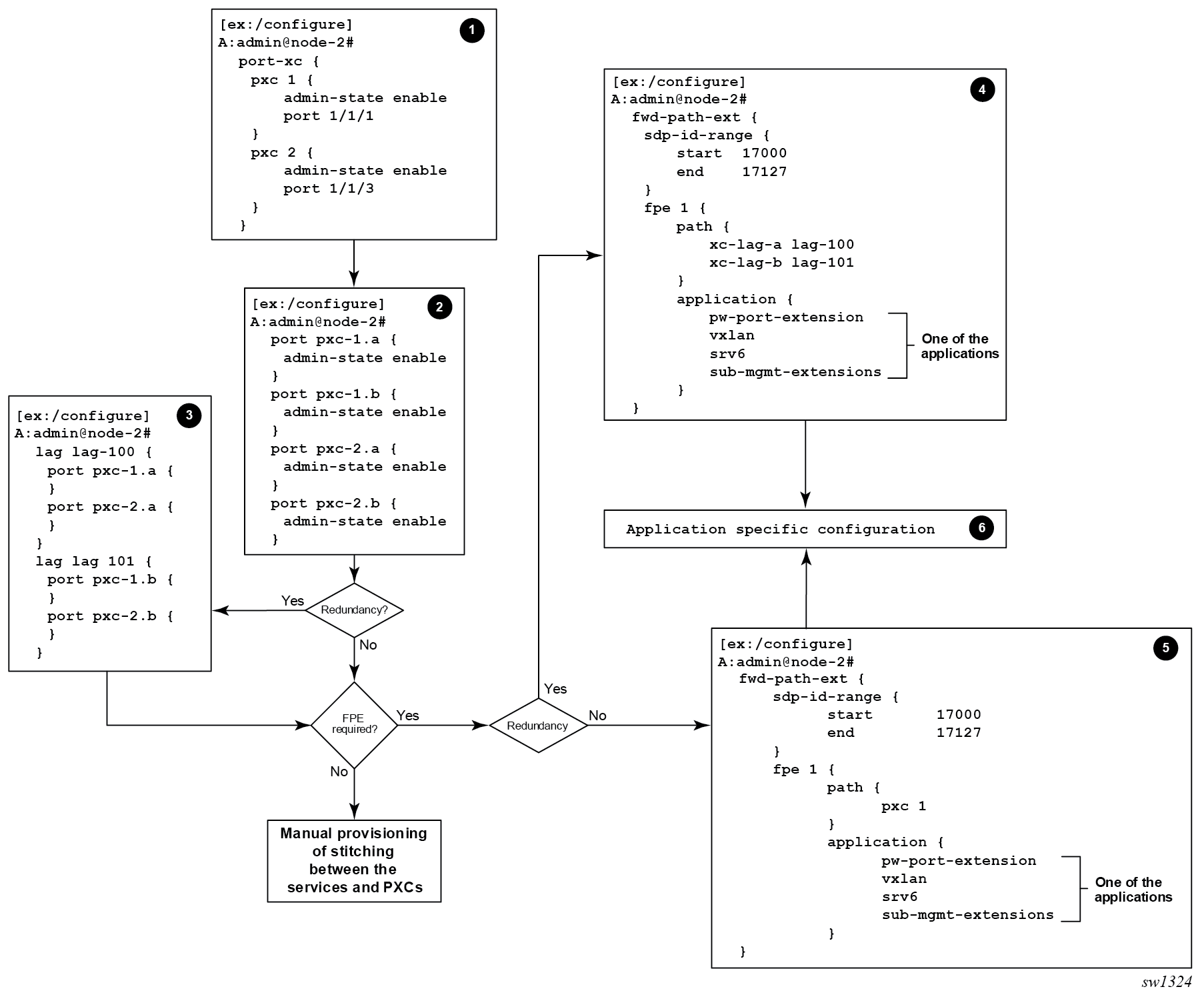 Association between the application and the PXC is performed in steps 4 and 5. These applications require internal configuration of SDPs and their IDs are allocated from the user configurable range. To prevent conflict between the user-provisioned SDP IDs and internally configured SDP IDs in FPE case, a range of SDP IDs that are used by FPE is reserved by the sdp-id-range commands under configure fwd-path-ext.