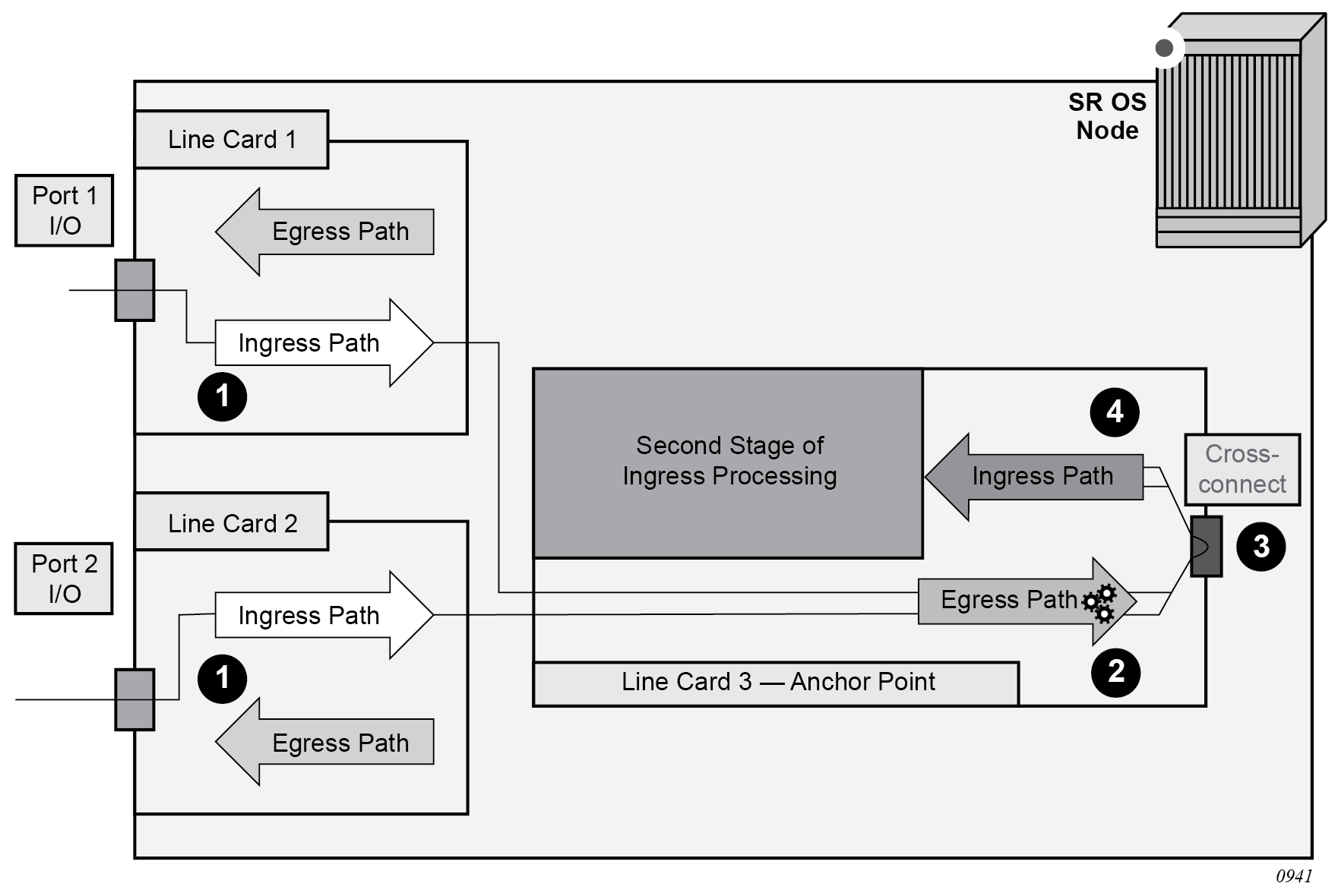 This section describes the Port Cross-Connect (PXC) feature implementation. PXC is a software concept representing a pair of logical ports interconnecting egress and ingress forwarding paths within the same forwarding complex (FC). In cross-connect functionality, an egress forwarding path is looped back to the ingress forwarding path on the same forwarding complex instead of leading out of the system. The FC is a chipset connected to a set of faceplate ports that processes traffic in the ingress direction (the ingress path) and the egress direction (the egress path). A line card can contain multiple FCs for increased throughput, but a single FC cannot be distributed over multiple line cards. The most common use for a cross-connect configuration is to process traffic entering the node. In this case, traffic passes through the ingress path twice. The first ingress pass is always on the FC on which traffic enters the node (an ingress line card), while the second ingress pass, achieved through the cross-connect, can be on any forwarding complex. The user can select to co-locate the ingress line card and the line card hosting the cross-connect. In this co-located case, traffic is looped through the same ingress forwarding path twice.