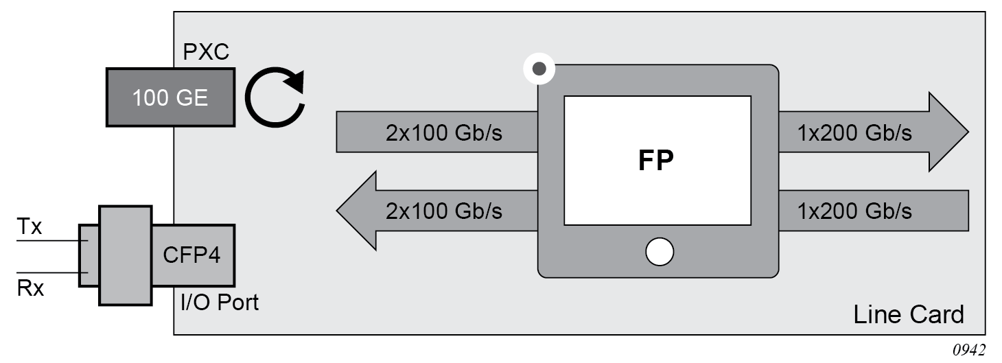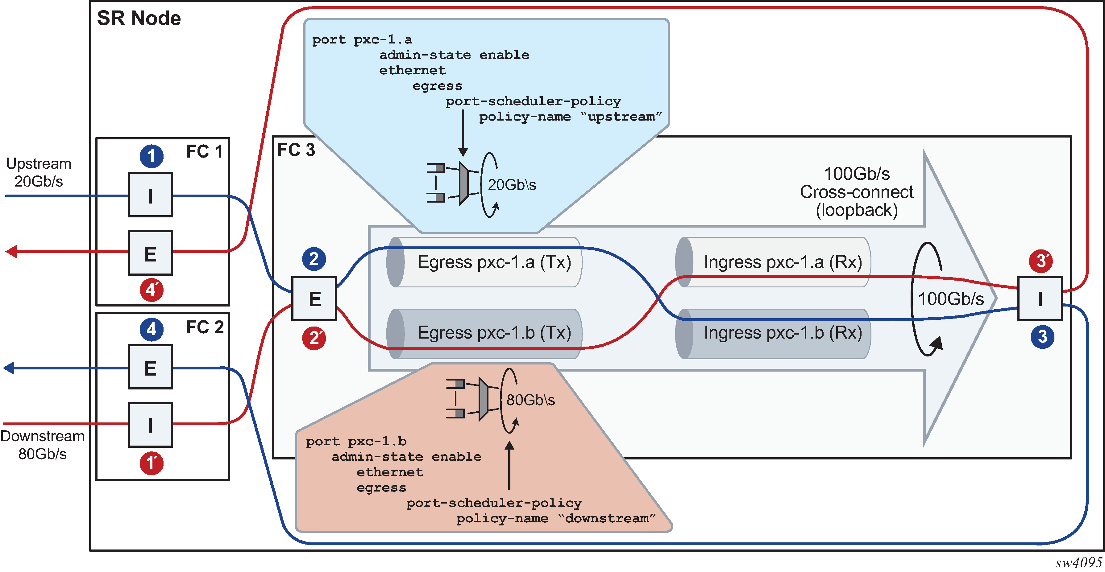 In both cases, the cross-connect is modeled in the system and in the CLI as a port, appropriately naming the feature Port Cross-Connect (PXC) software concept representing a pair of logical ports interconnecting egress and ingress forwarding paths within the same forwarding complex.