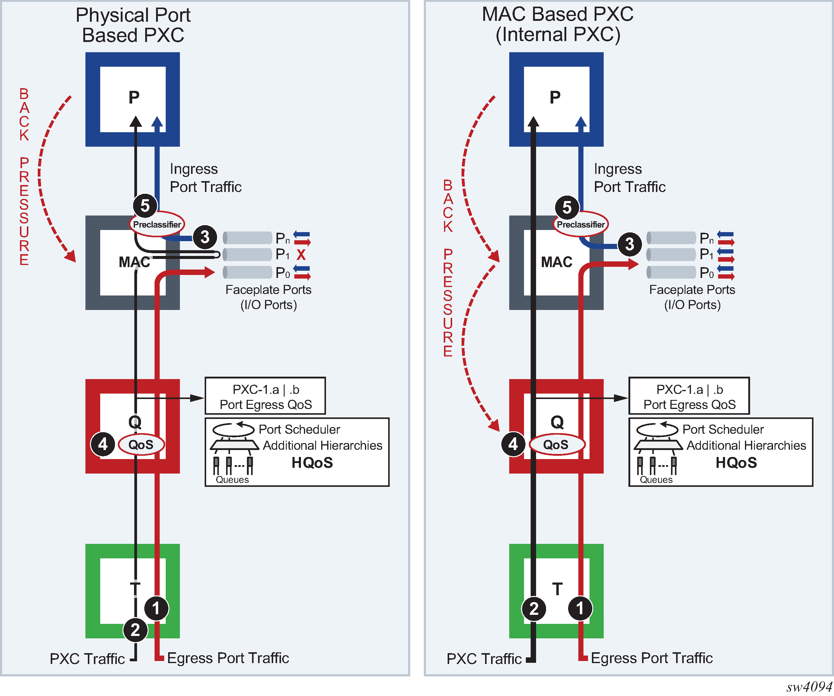Conceptually, PXC functionality is similar to the functionality provided by two externally interconnected faceplate ports where traffic exits the system through one port (the egress path) and is immediately looped back into another port (the ingress path) through a cable.