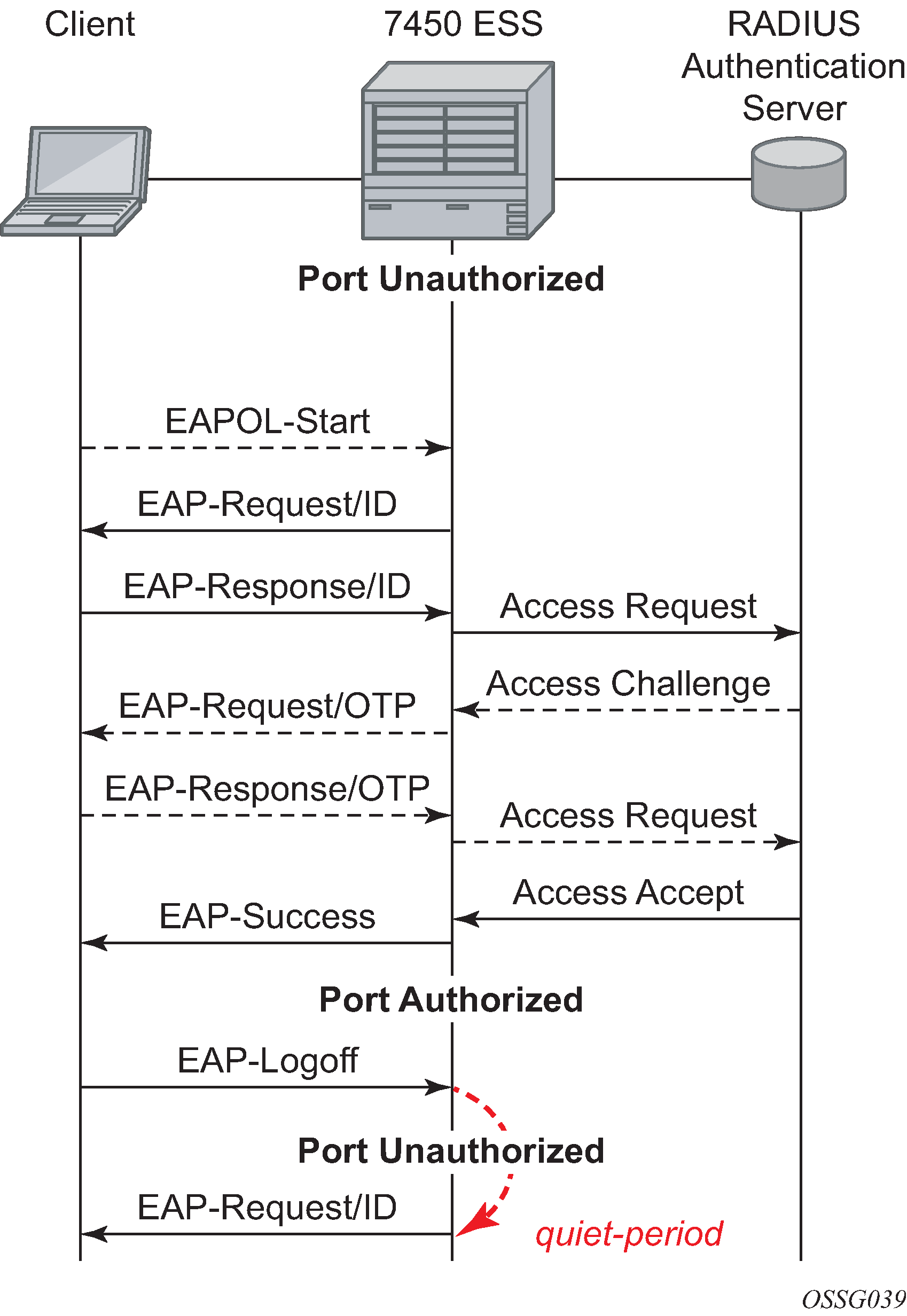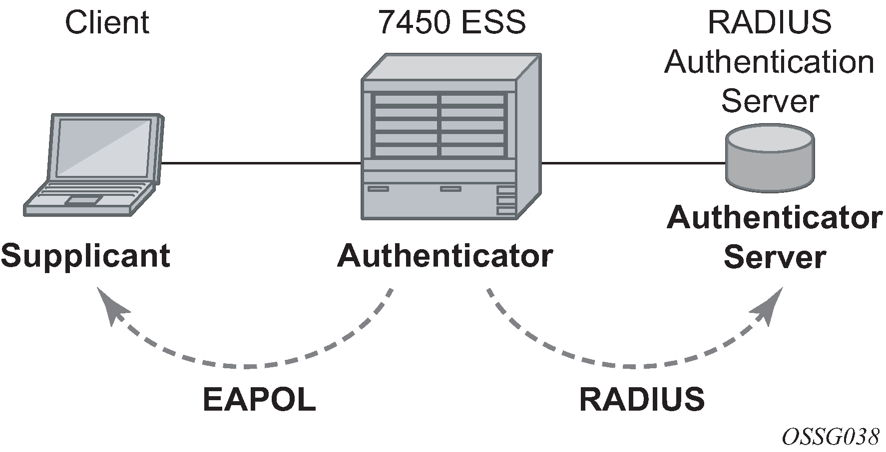 The IEEE 802.1x standard defines three participants in an authentication conversation (see 802.1x architecture that shows an example with the 7450 ESS).