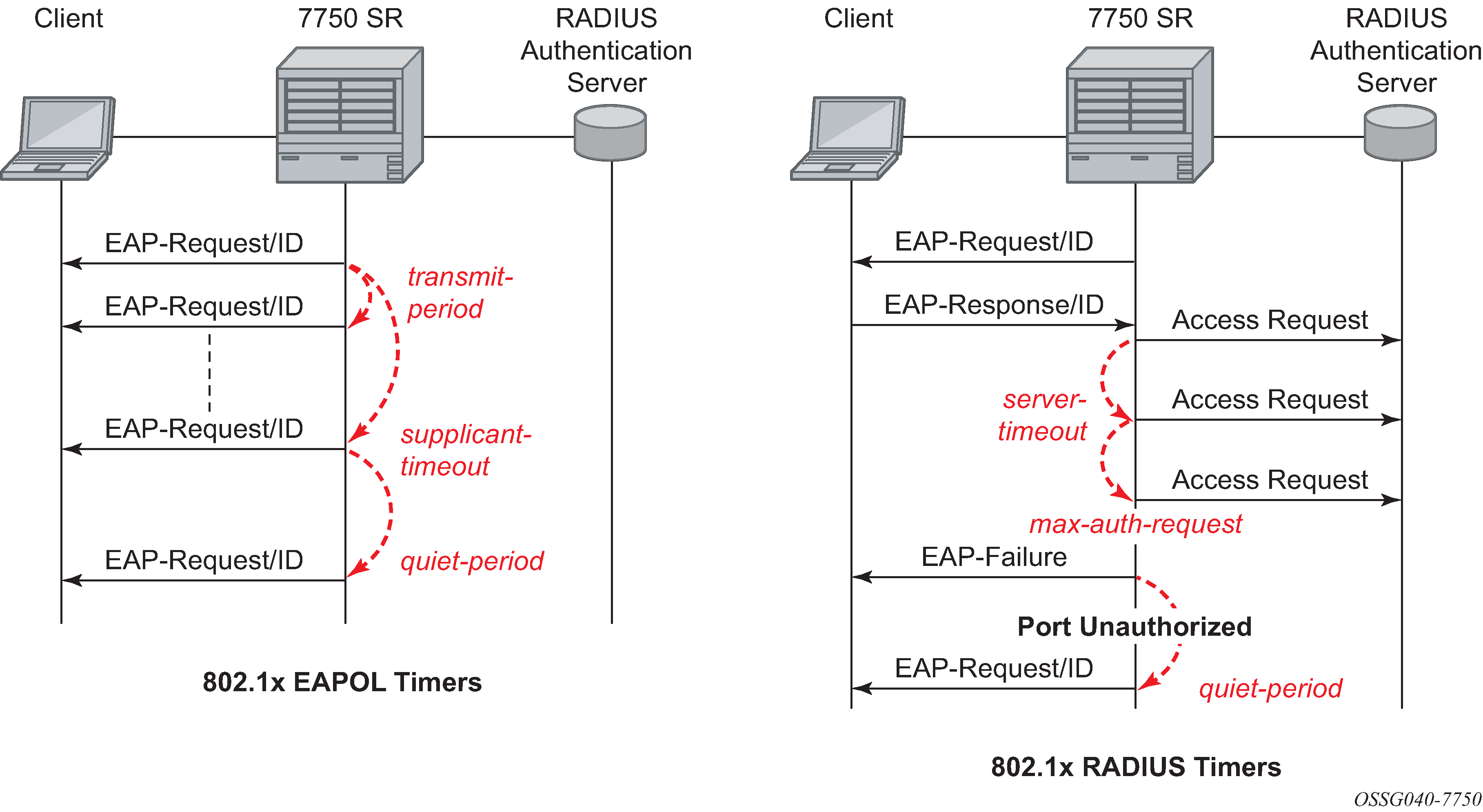 The 802.1x authentication procedure is controlled by a number of configurable timers and scalars. There are two separate sets, one for the EAPOL message exchange and one for the RADIUS message exchange. See 802.1x EAPOL timers (left) and RADIUS timers (right) for an example of the timers on the 7750 SR.