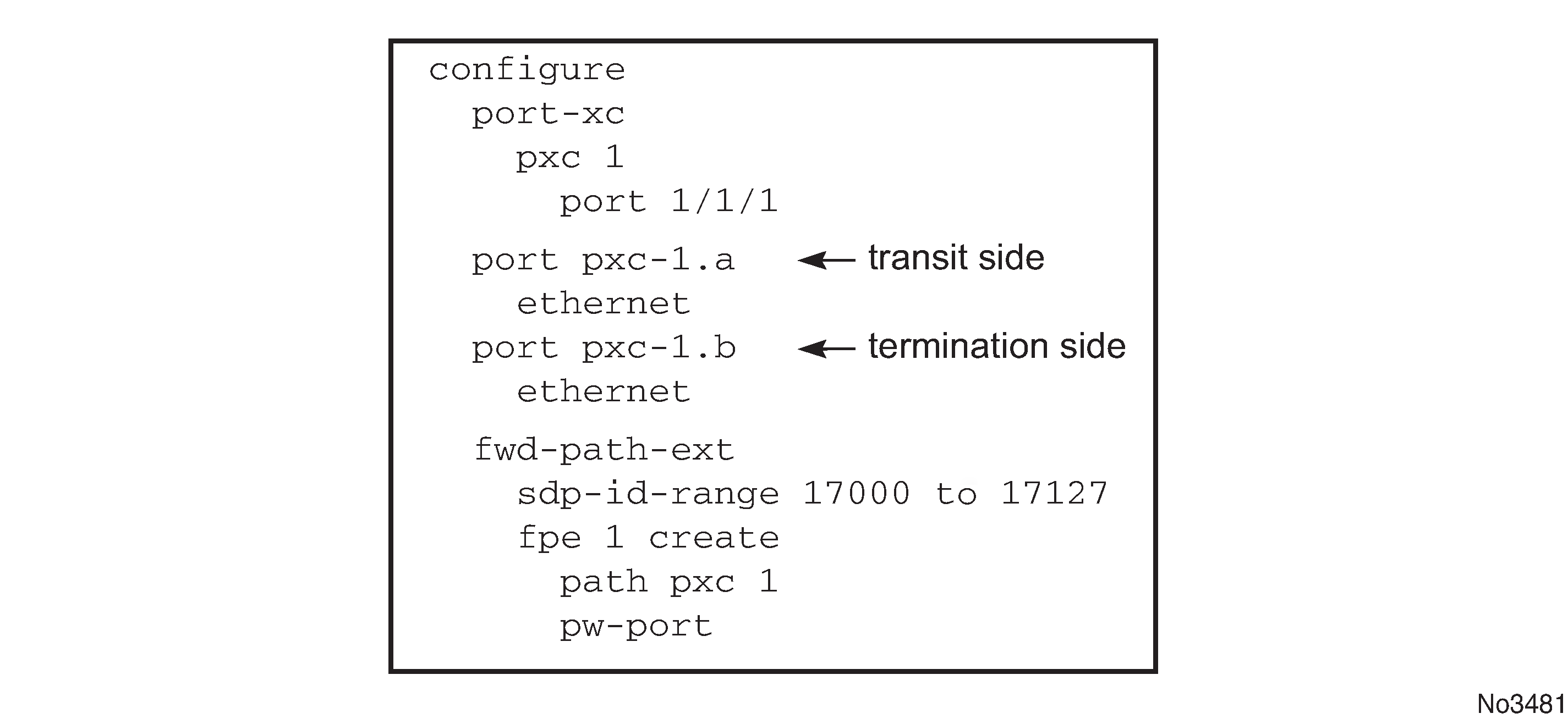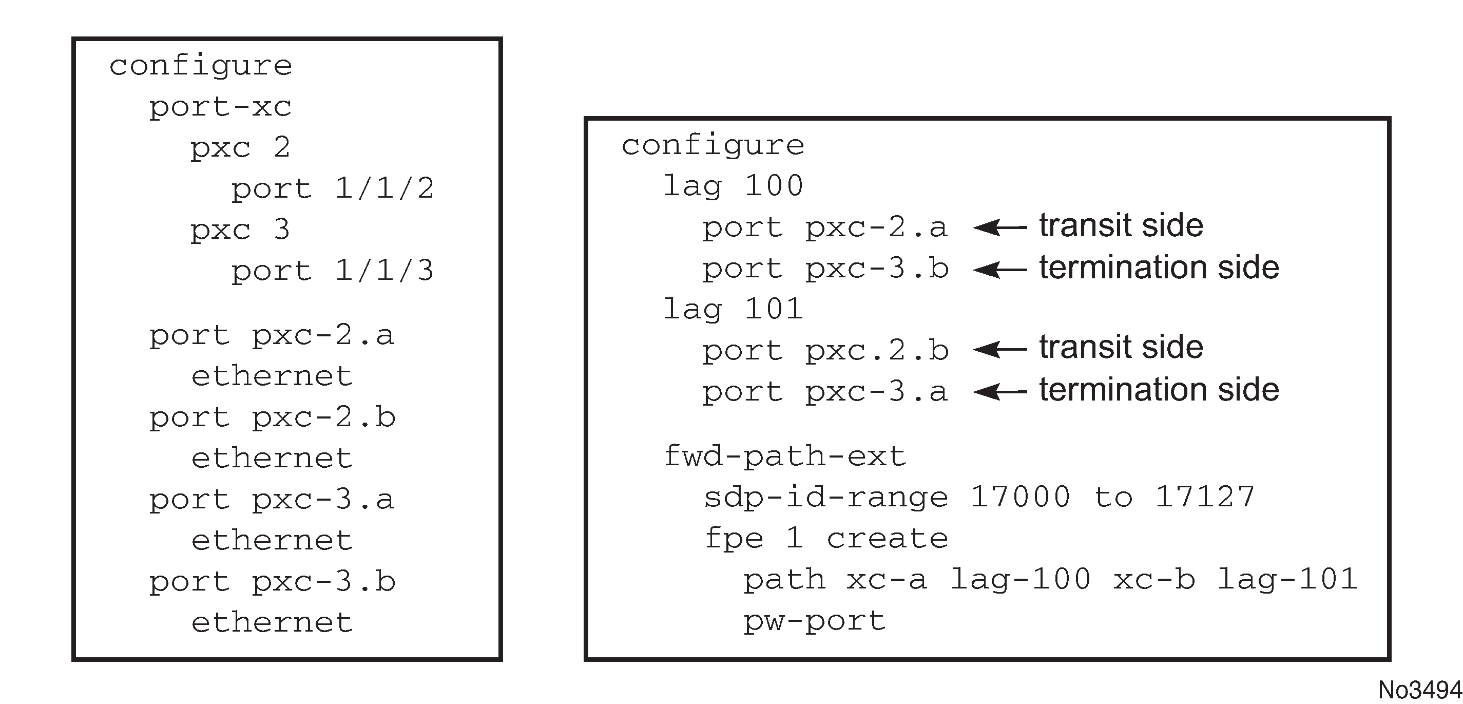 xc-a and xc-b can be associated with any PXC based LAG ID. For example, the following path configuration is allowed: xc-a with lag-id 100 (which includes pxc sub-ports pxc-2.a and pxc-3.b) and xc-b with lag-id 101 (which includes pxc sub-ports pxc-3.a and pxc-2.b). Regardless of the pxc sub-ports that are assigned to respective LAGs, the xc-a side of the path is used as the transit side of the cross-connect, while the xc-b side of the path is used as the termination side of the cross-connect.