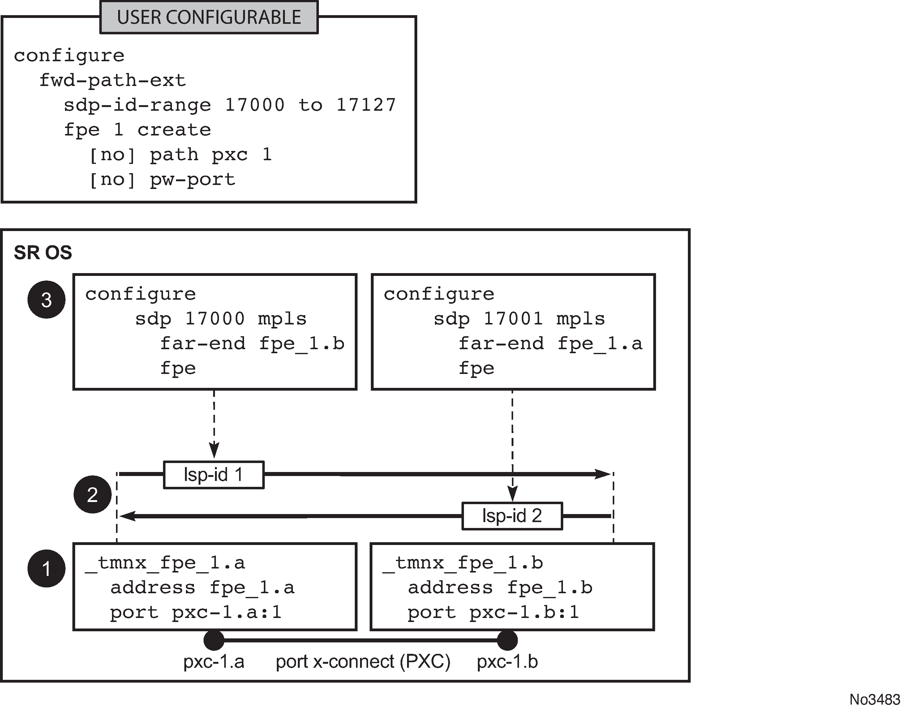 After the fpe is configured (see the 7450 ESS, 7750 SR, 7950 XRS, and VSR Interface Configuration Guide, "Forwarding Path Extensions"), the SR OS system automatically configures steps 1, 2 and 3 in Building the internal LSP over PXCs. The objects created in steps 1, 2 and 3 can be seen via show commands. However, they are not visible to the user in the configure branch of CLI.