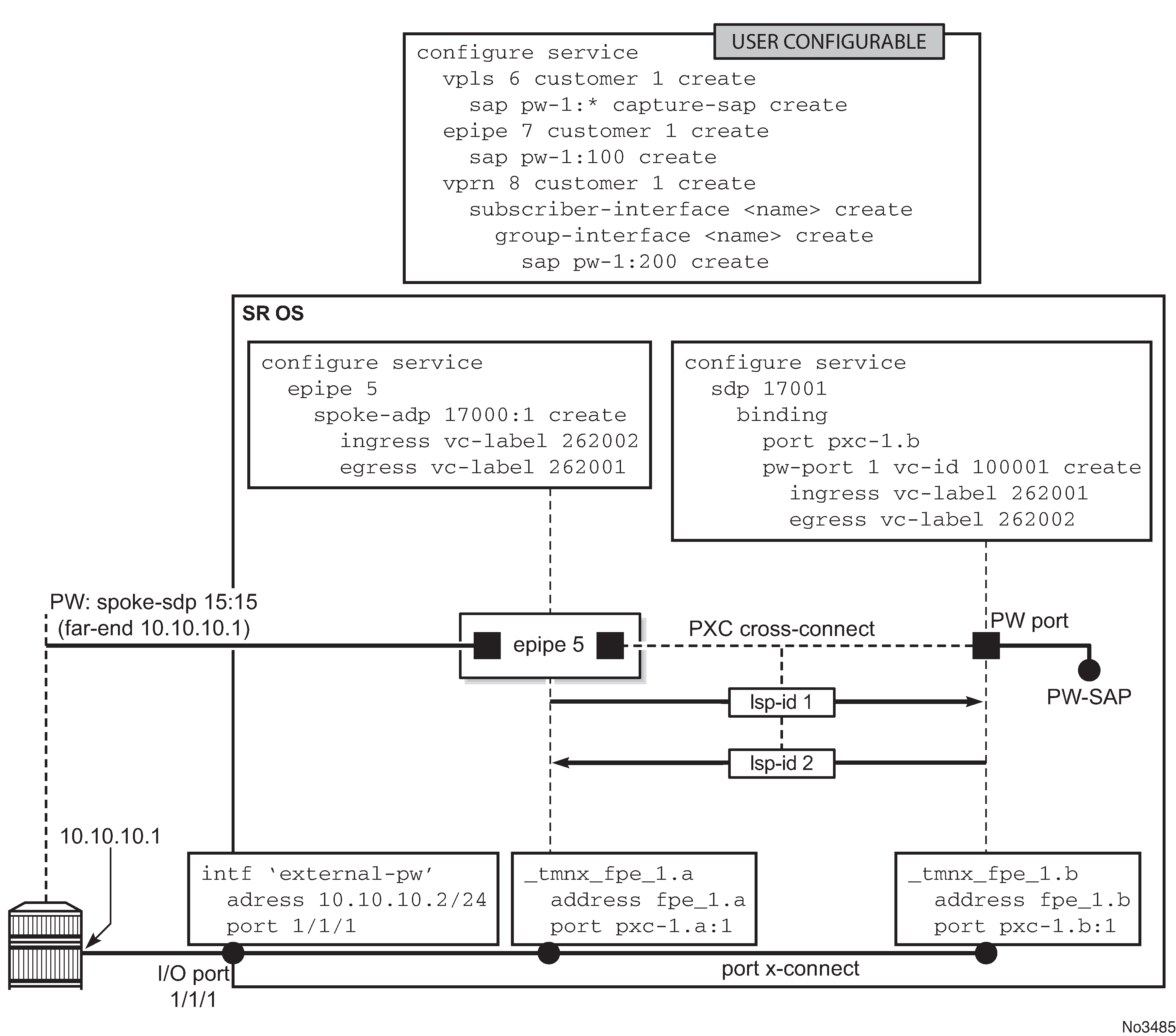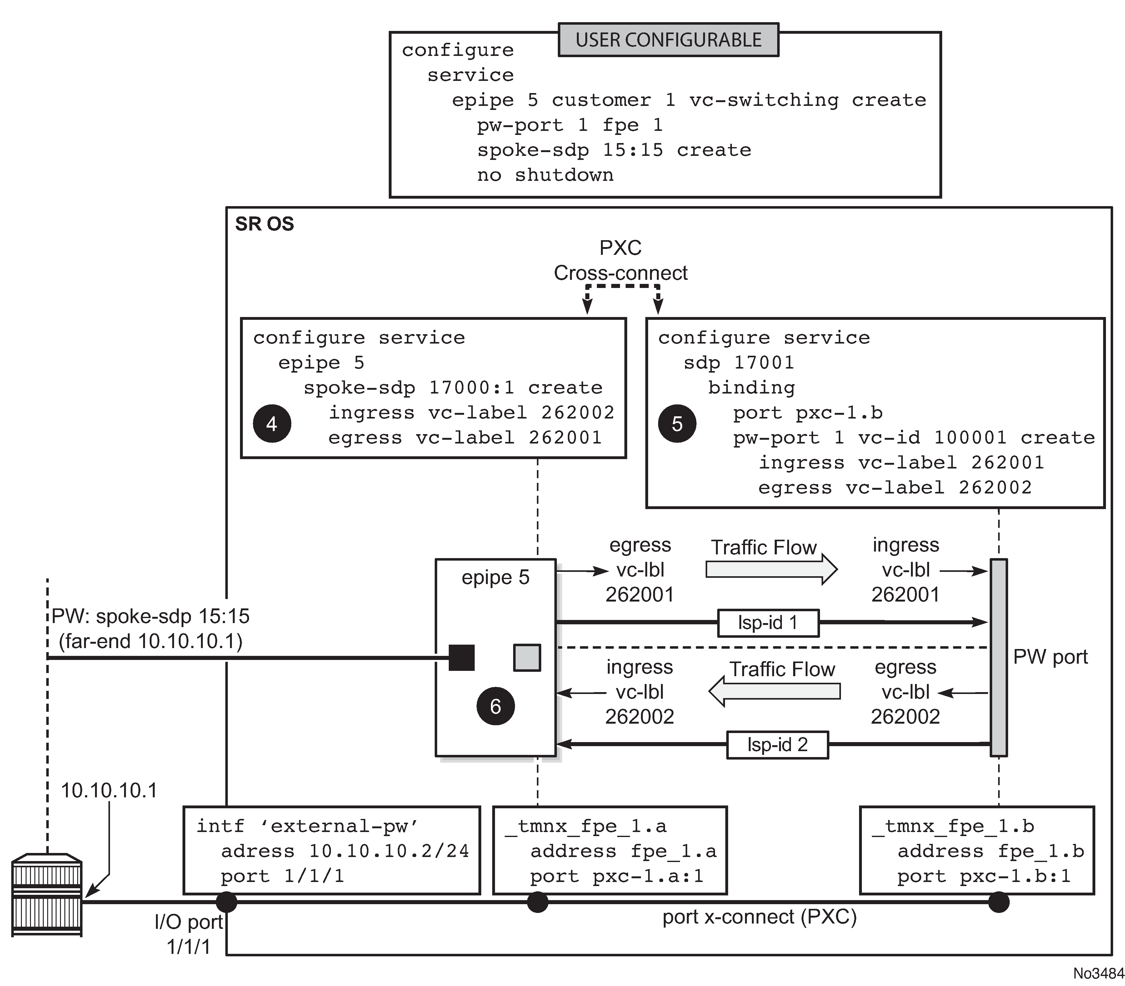 Mapping between the external PW and the FPE based PW-port is performed via an Epipe of type vc-switching. The user configurable Epipe (id 5 in this example) aids in setting up steps 4, 5 and 6 in Mapping between the external PW and the PXC based PW-port: