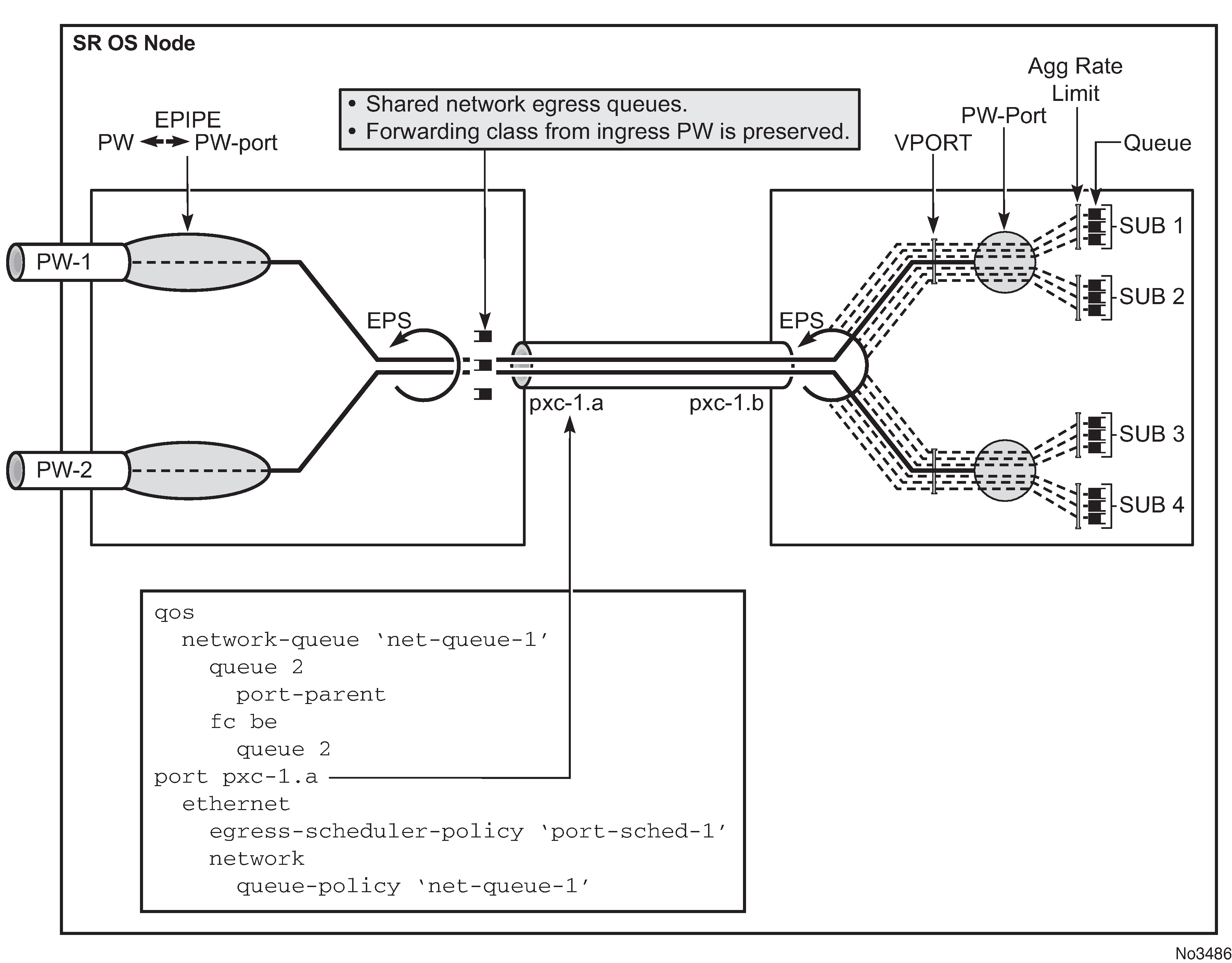 QoS fundamentals for the case where multiple PWs are multiplexed over a single cross-connect are shown in QoS on FPE-based PW-port.