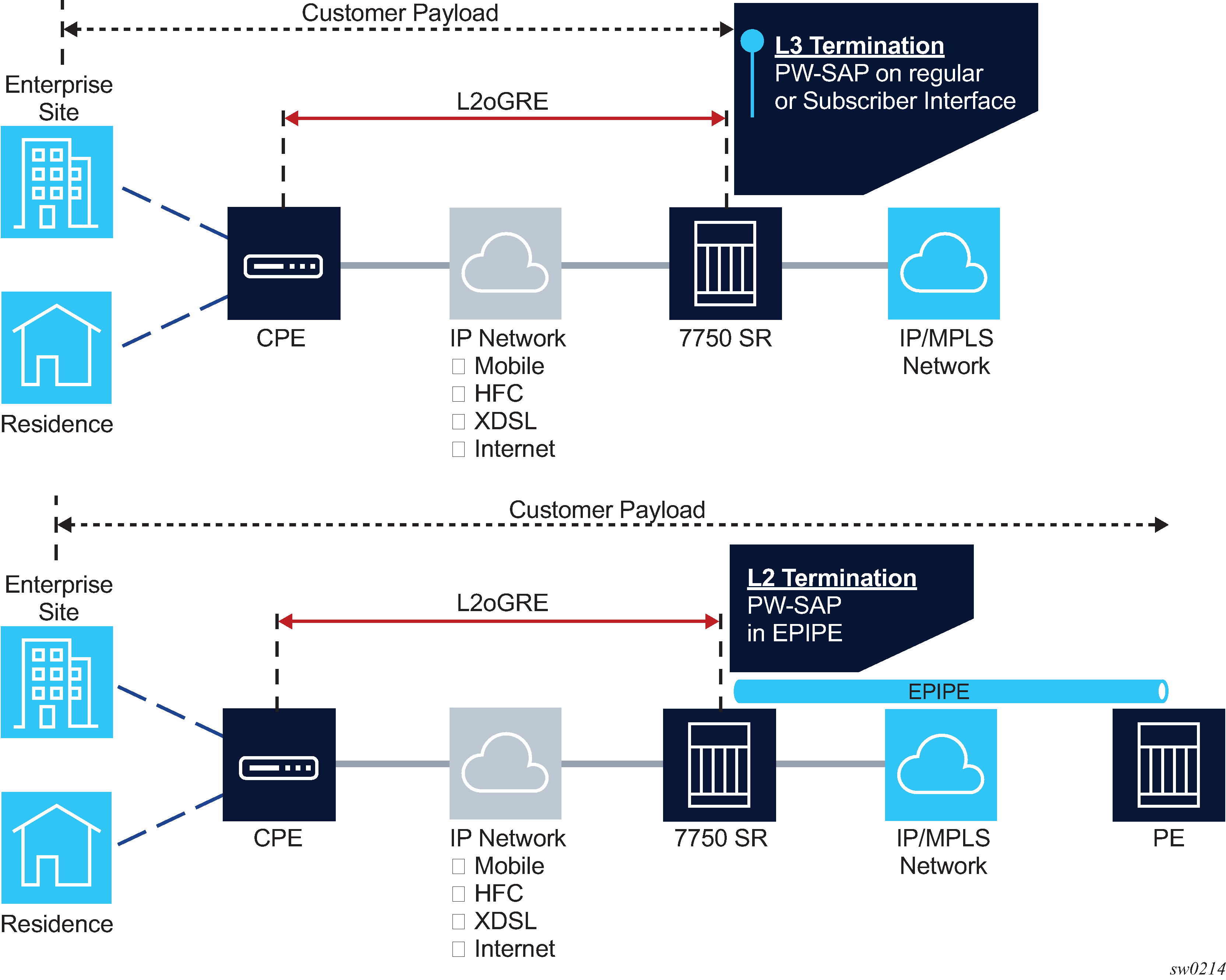 A customer payload within L2oGRE can be extracted onto a PW SAP inside an SR OS node. This PW SAP can be configured under an interface, subscriber interface, or an Epipe. When on a PW SAP, customer traffic can be passed further into the network to its destination using Layer 2 or Layer 3 services. End-to-end Layer 2 and Layer 3 scenarios are described in the following sections.