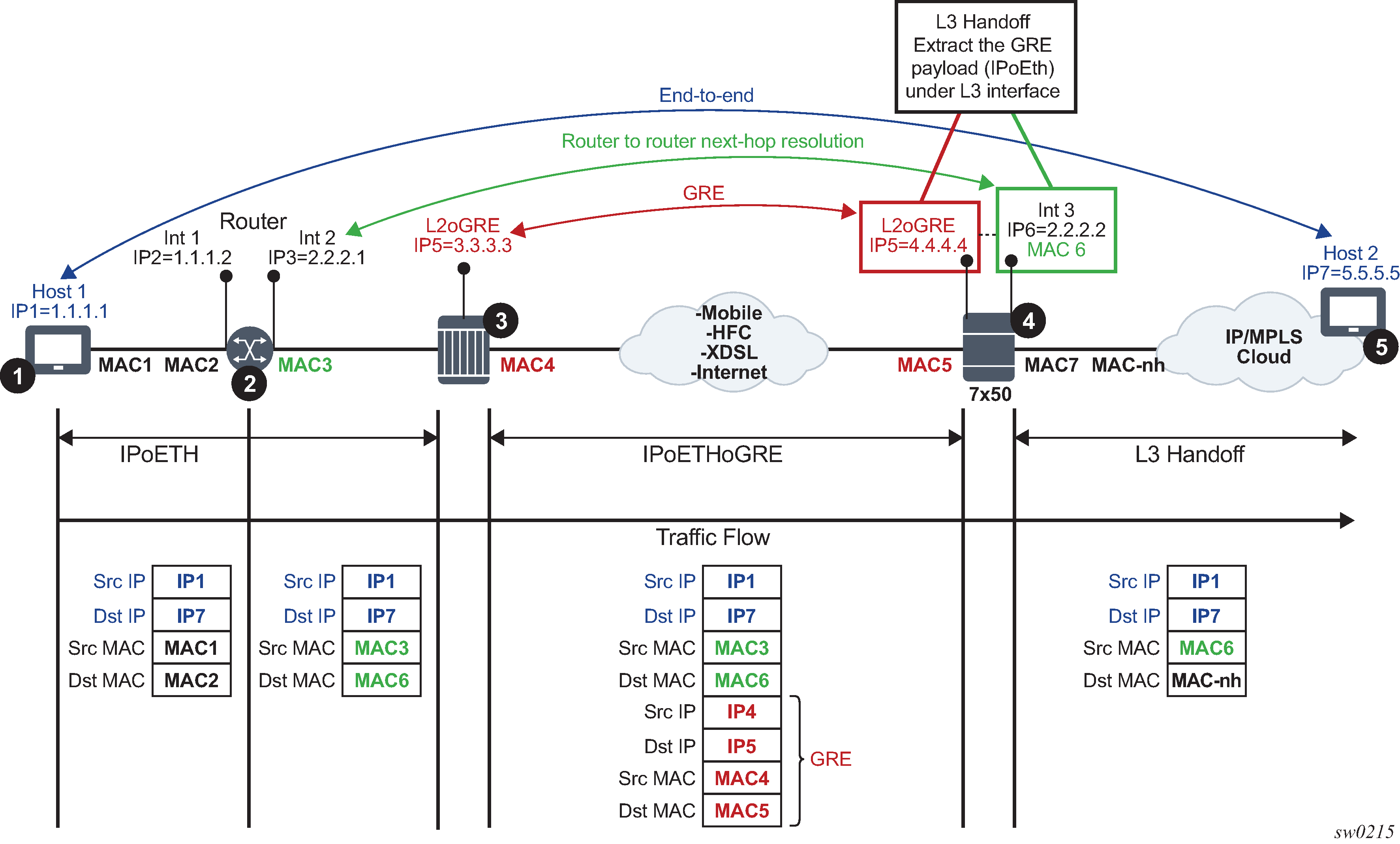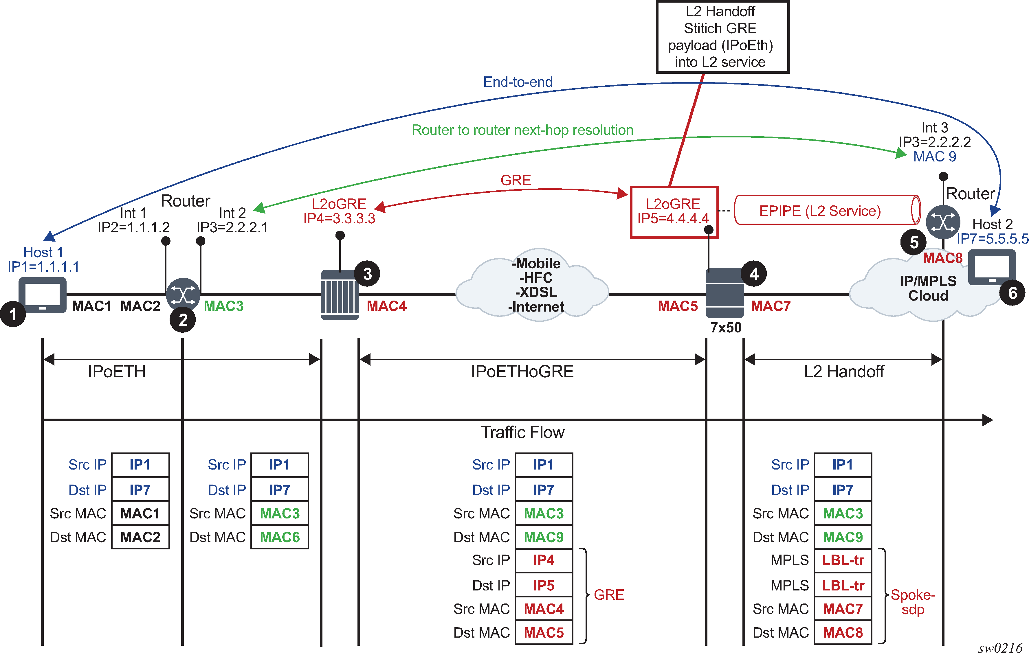 The SR OS node at point 4 de-encapsulates the packet and sends it into the Layer 2 service that leads to the node at point 5.