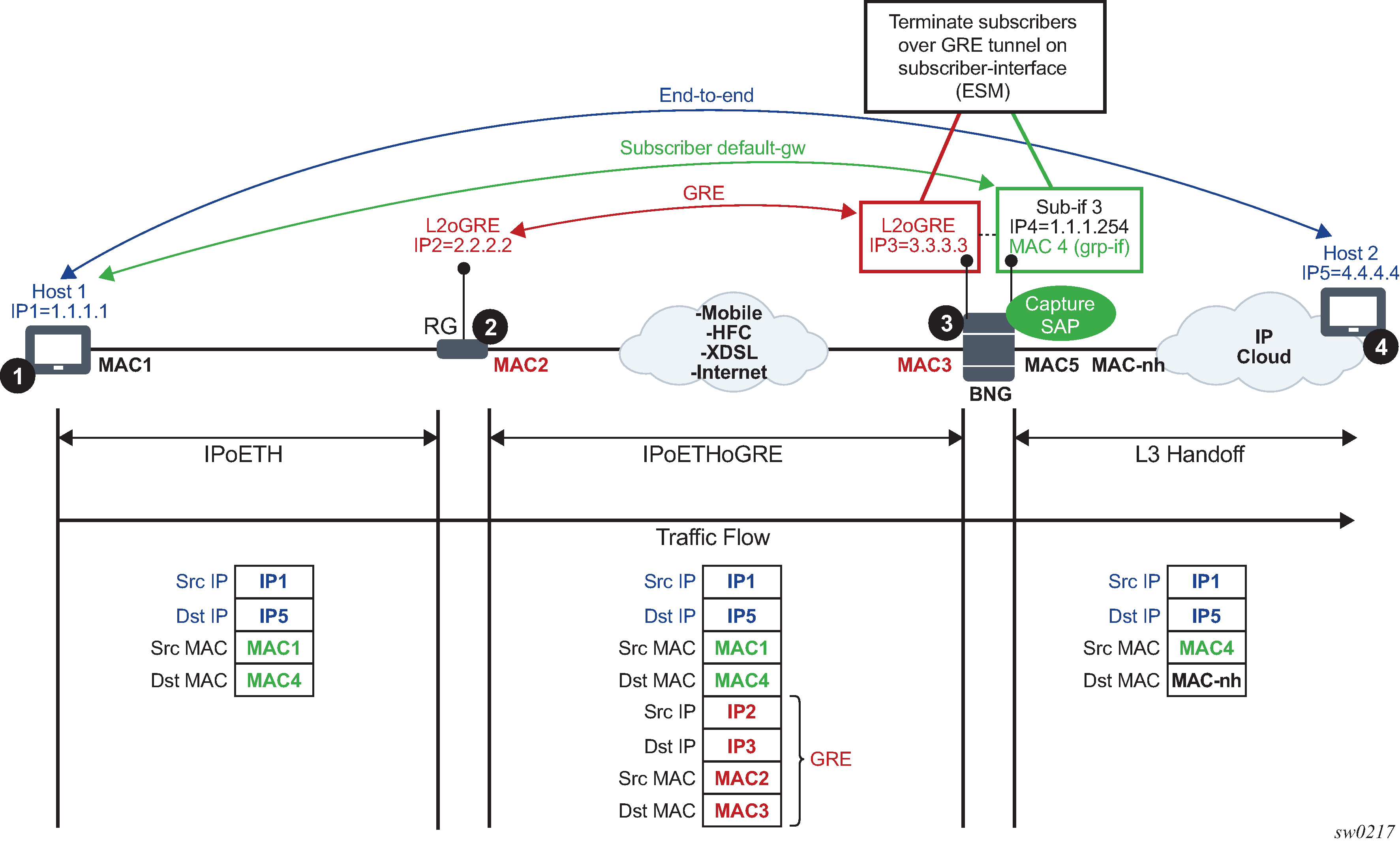 RG (Residential Gateway) at point 2 encapsulates L2 customer frames into GRE and sends them to the SR OS node.