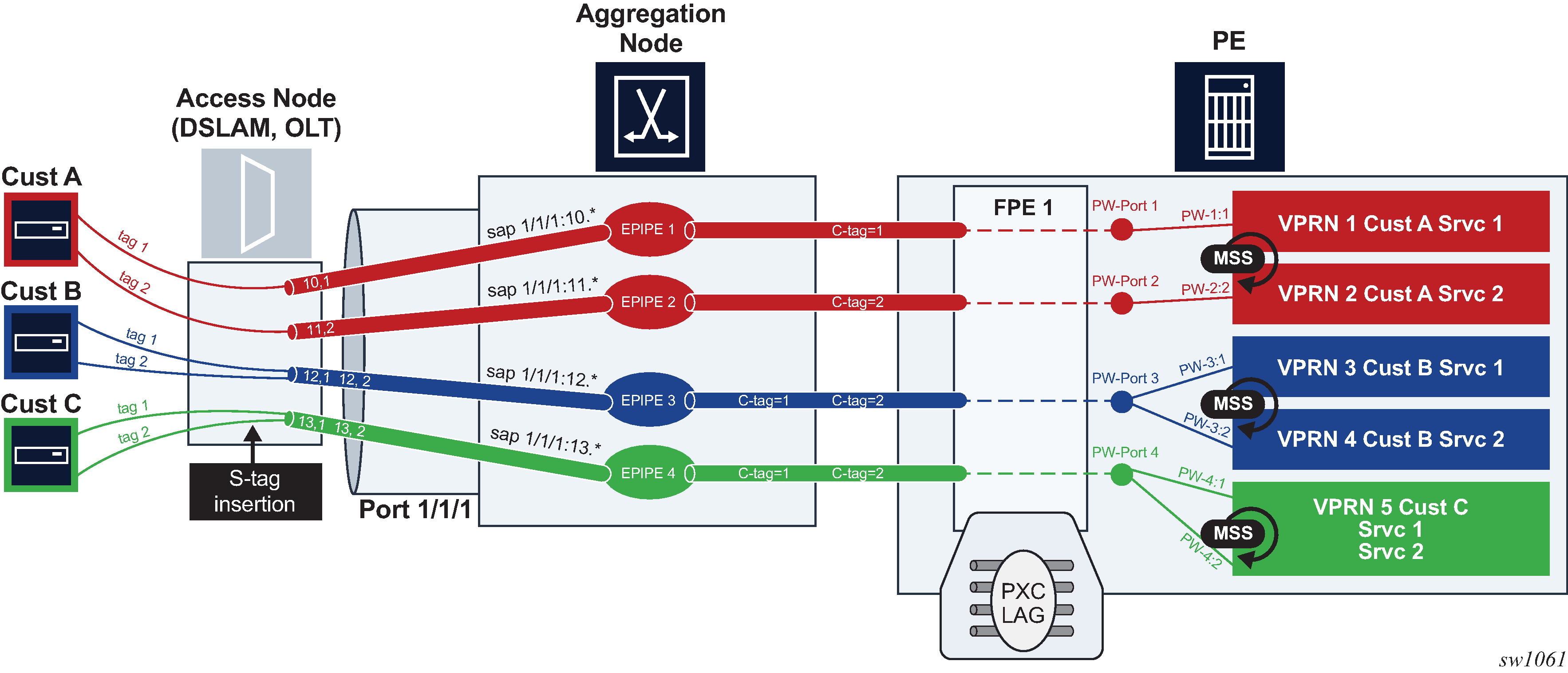 PW payload delivery from the I/O ports to the FPE based PW-port (and SAP) is facilitated via an internal cross-connect which is built on top of PXC sub-ports. Such cross-connect allows for mapping between PWs and PW-ports even in cases where PW payloads have overlapping VLANS. This concept is shown in Multiplexing PWs over PXC-based internal cross-connect .