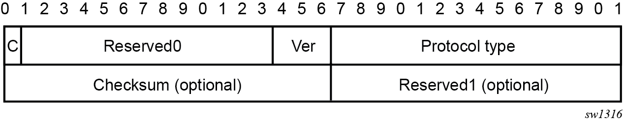 If the GRE delivery protocol is IPv4, then the protocol field in IPv4 header is set to value 47 (GRE). The same value (47 – GRE) is used on the Next Header field if the delivery protocol is IPv6. IPv6 extension headers in the L2oGRE transport IPv6 header are not supported, and packets containing these IPv6 extension headers are dropped.
