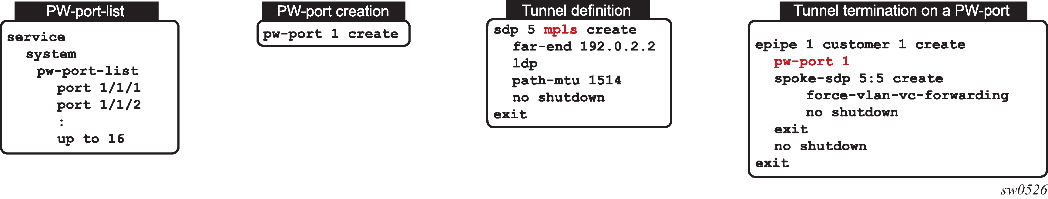 The termination of a MPLS-based spoke SDP on a Flex PW port follows the common provisioning framework: