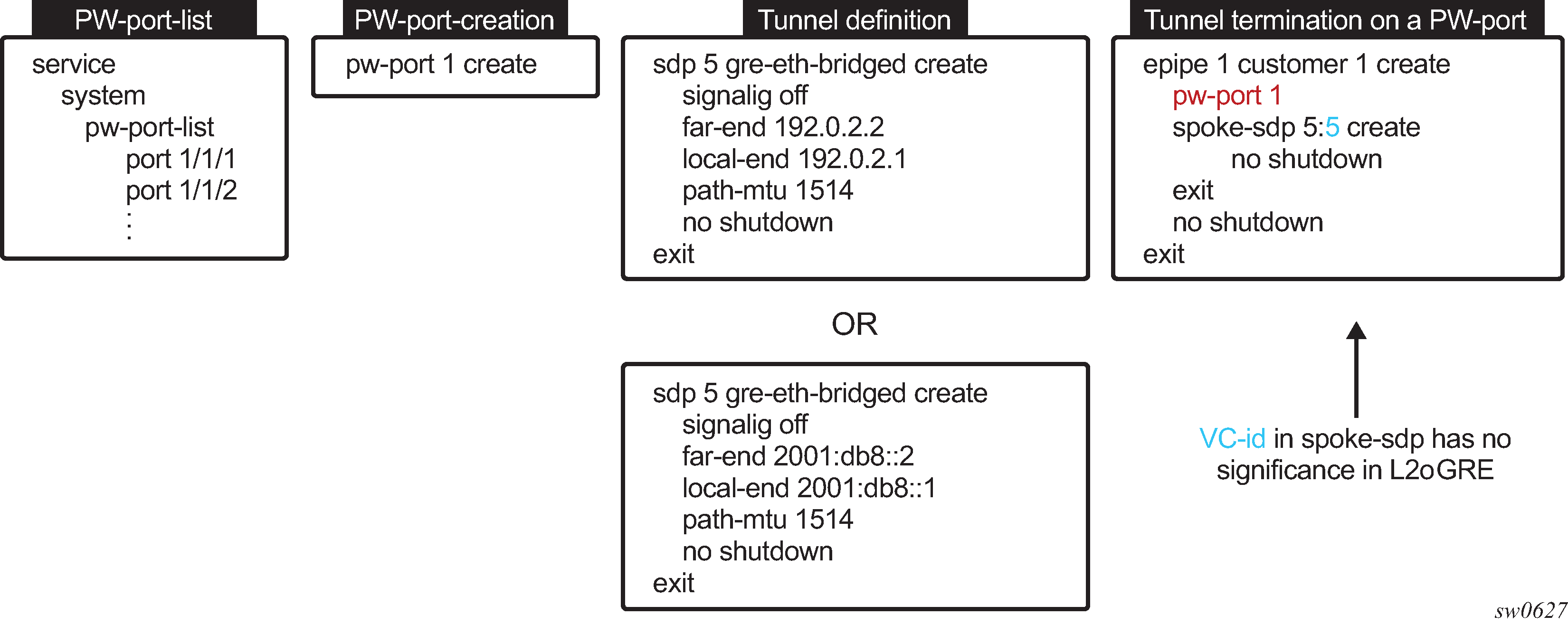Terminate a tunnel on a PW port via an Epipe service. A PW port must be configured within the Epipe before a spoke SDP is added to the same Epipe.