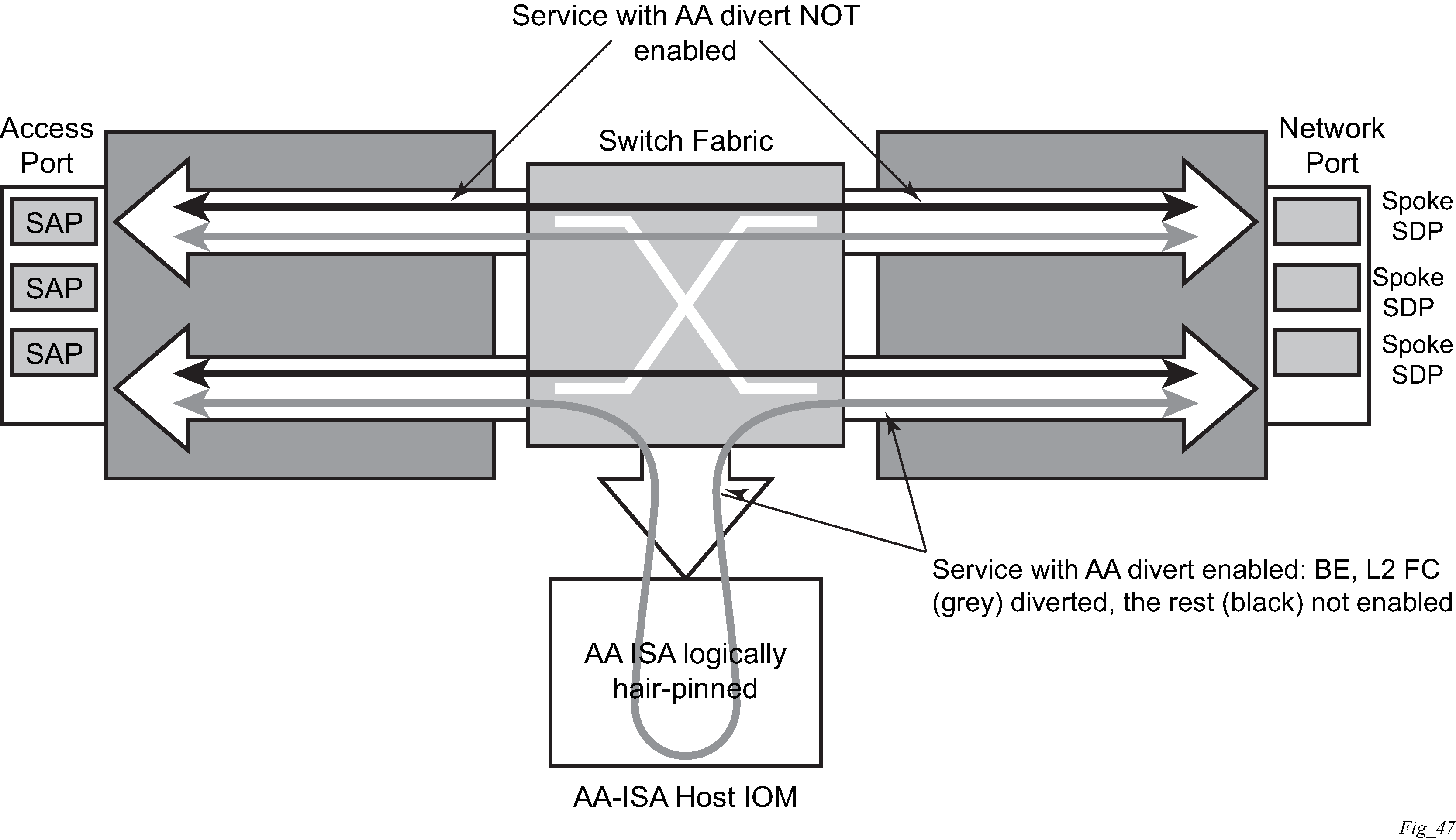 A key benefit of integrating AA in the existing IP/MPLS network infrastructure (as opposed to an inline appliance) is the ability to select traffic for treatment on a granular, reliable basis. Only traffic that requires AA treatment is simply and transparently diverted to the ISA. Other traffic from within the same service or interface follows the normal forwarding path across the fabric. In the case of ISA failure, ISA redundancy is supported and in the case where no backup ISAs are available, the AA traffic reverts to the normal fabric matrix forwarding, also known as ‟fail to fabric”.