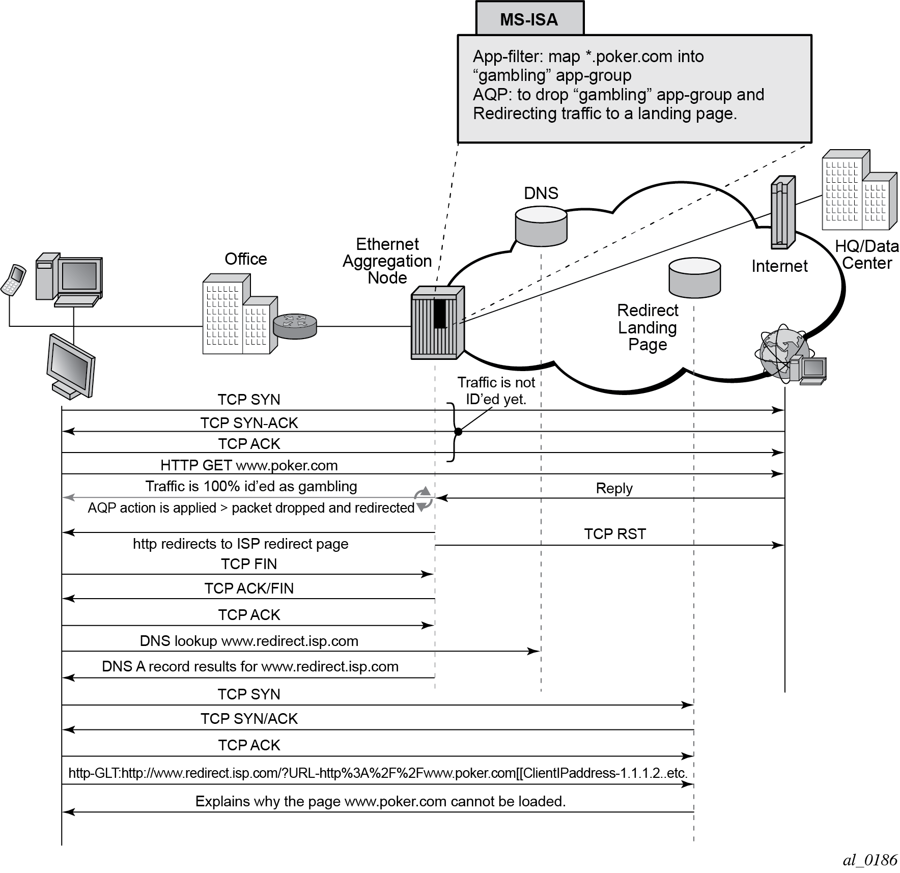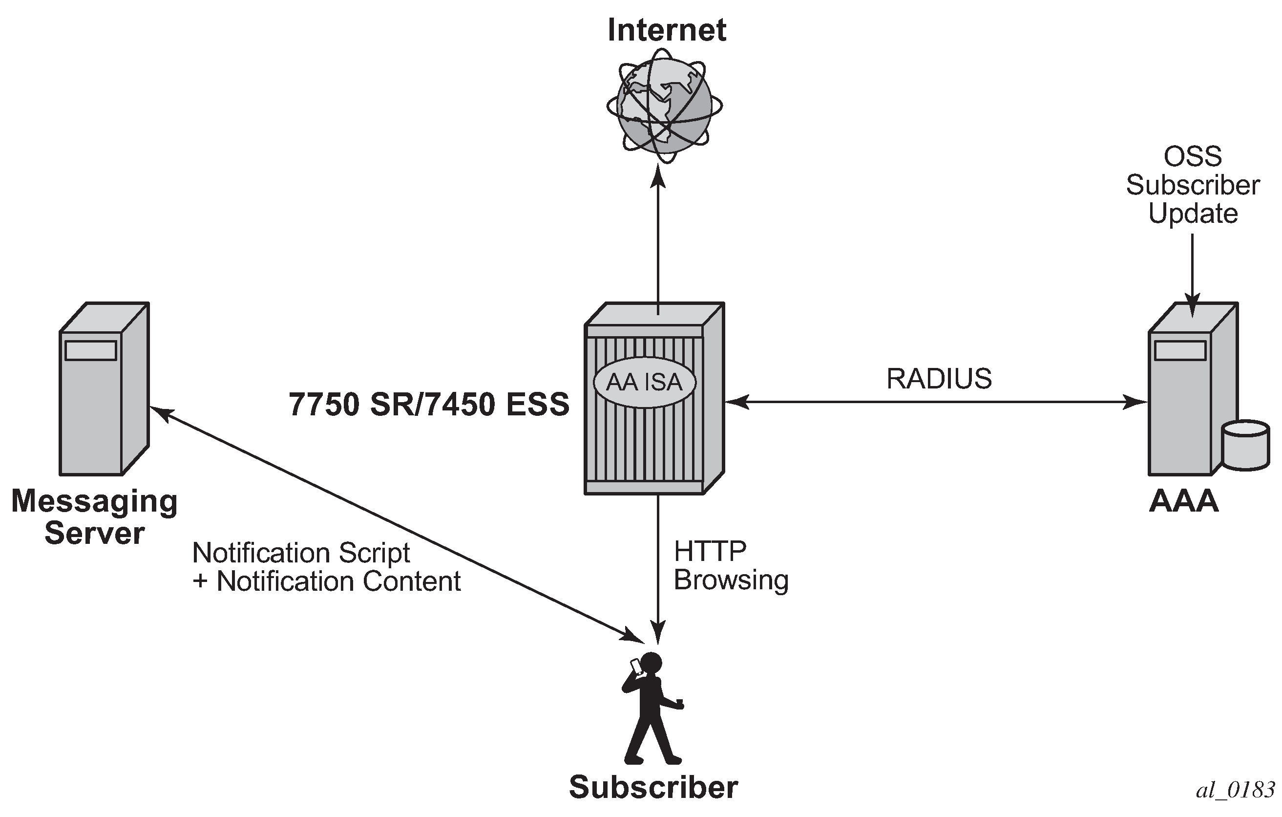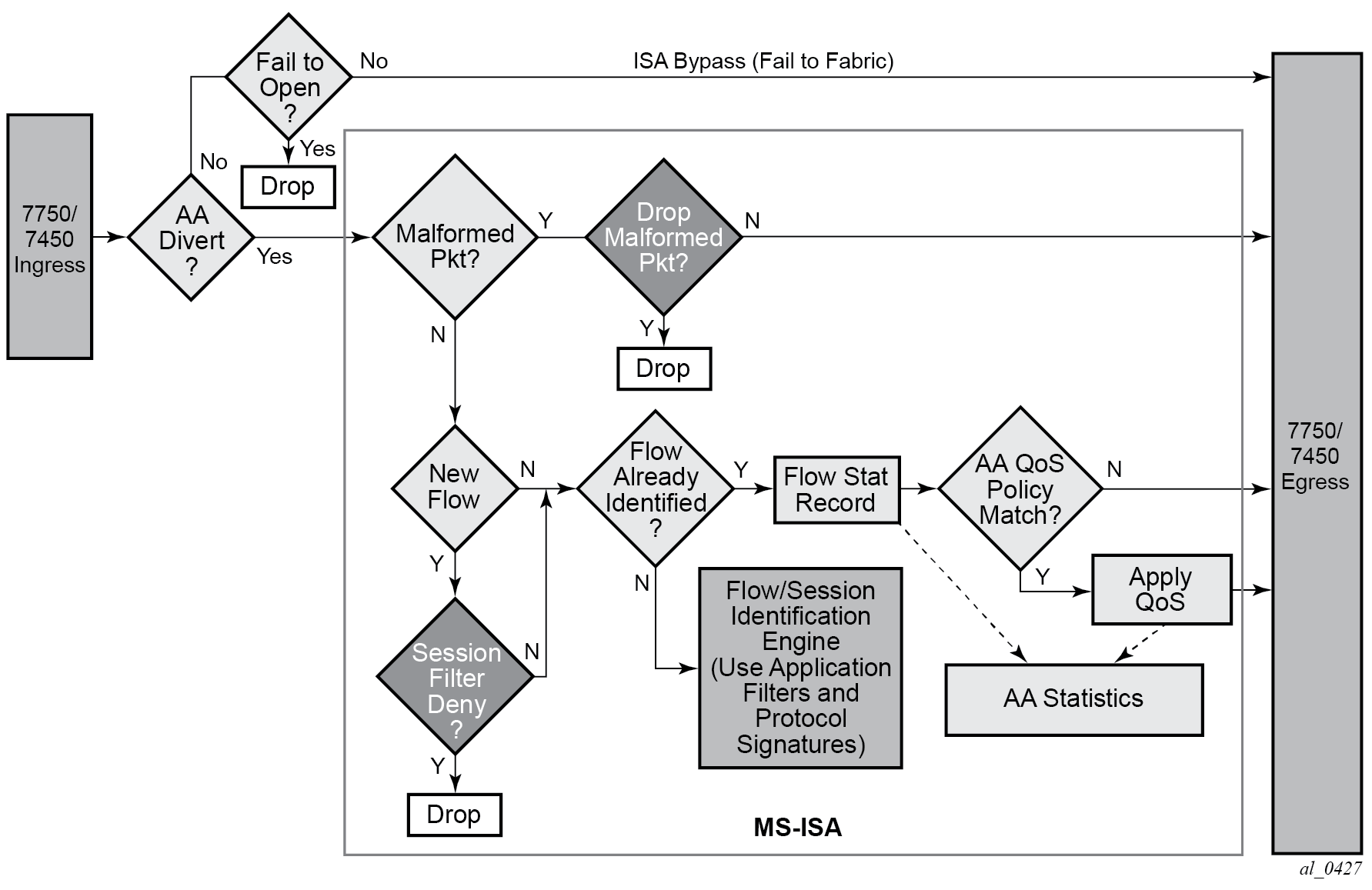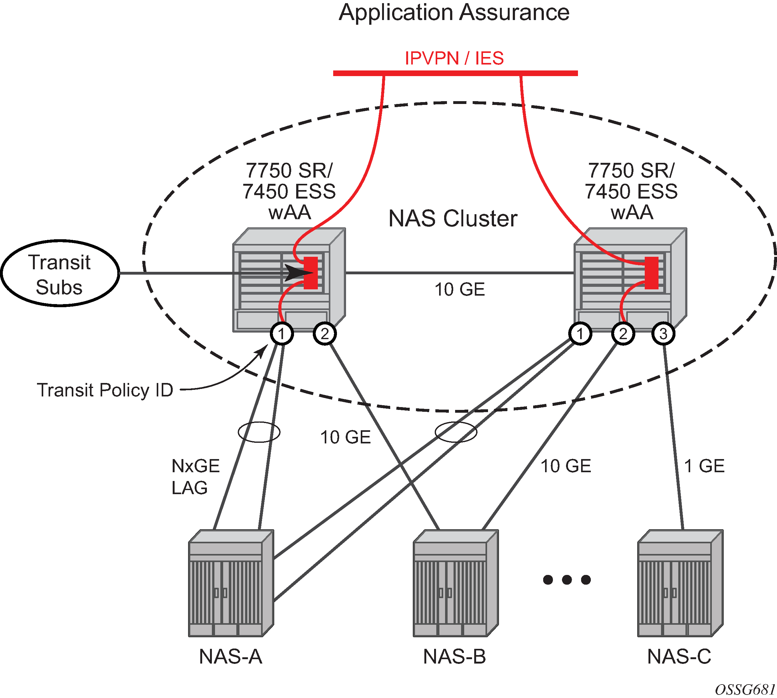 Integrating Layer 4 to Layer 7 application policy with the 7750 SR or 7450 ESS subscriber edge policy context is the primary solution to address both residential broadband edge and Layer 2 or Layer 3 application aware business VPN. Placement of Layer 4 to Layer 7 analysis at the distributed subscriber edge policy point simplifies AA deployments in the following ways:
