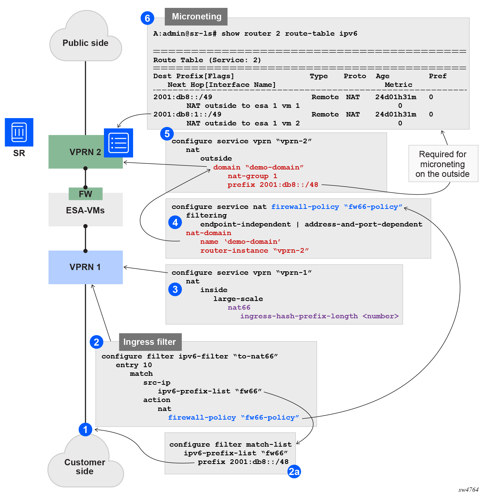 configure service vprn "inside" configure router nat inside nat66 destination-prefix 2001:db8::/96 firewall-policy “demo-fw-policy-1”